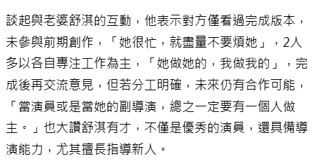【冯德伦说舒淇忙尽量不烦她】冯德伦评价舒淇导演能力最近,冯德伦正在为筹备四年的动画IP《Bucket Man》做宣传,并献唱宣传曲《屡战屡败又怎样》,谈起与老婆舒淇的互动,他表示对方仅看过完成版本,未参与前期创作,“她很忙,就尽量不要烦她”,2人多以各自专注工作为主,“她做她的,我做我的”,完成后再交流意见,但若分工明确,未来仍有合作可能,“当演员或是当她的副导演,总之一定要有一个人做主。”他也大赞舒淇有才,不仅是优秀的演员,还具备导演能力,尤其擅长指导新人。(中时新闻网)