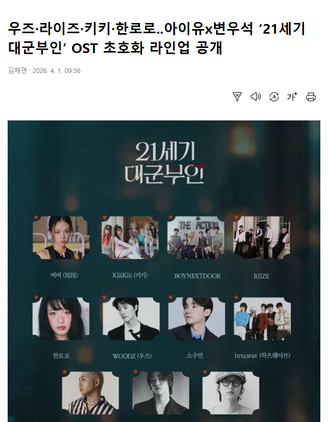 Kakao Ent公开了将于4月10日首播的MBC新剧《21世纪大君夫人》OST阵容。RIIZE、BOYNEXTDOOR、BIBI、SAM KIM、苏秀彬、ALEPH、曹承衍、林钟元、KiiiKiii、Hanroro、hrtz.wav,共有11组歌手参与。
