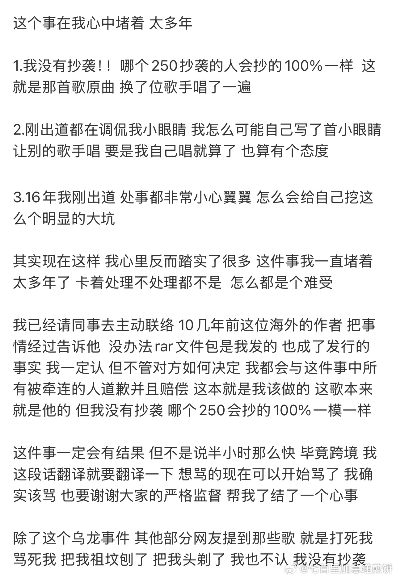 否认自己抄袭,《小眼睛》这首歌是早期以扒带的形式来练习音乐制作,不是拿来卖,但被自己误打包发给了版权公司。后来他和版权公司沟通联系海外作者,但因公司结业不了了之,目前已经请同事联系了10年前的这位版权作者,道歉并赔偿。
