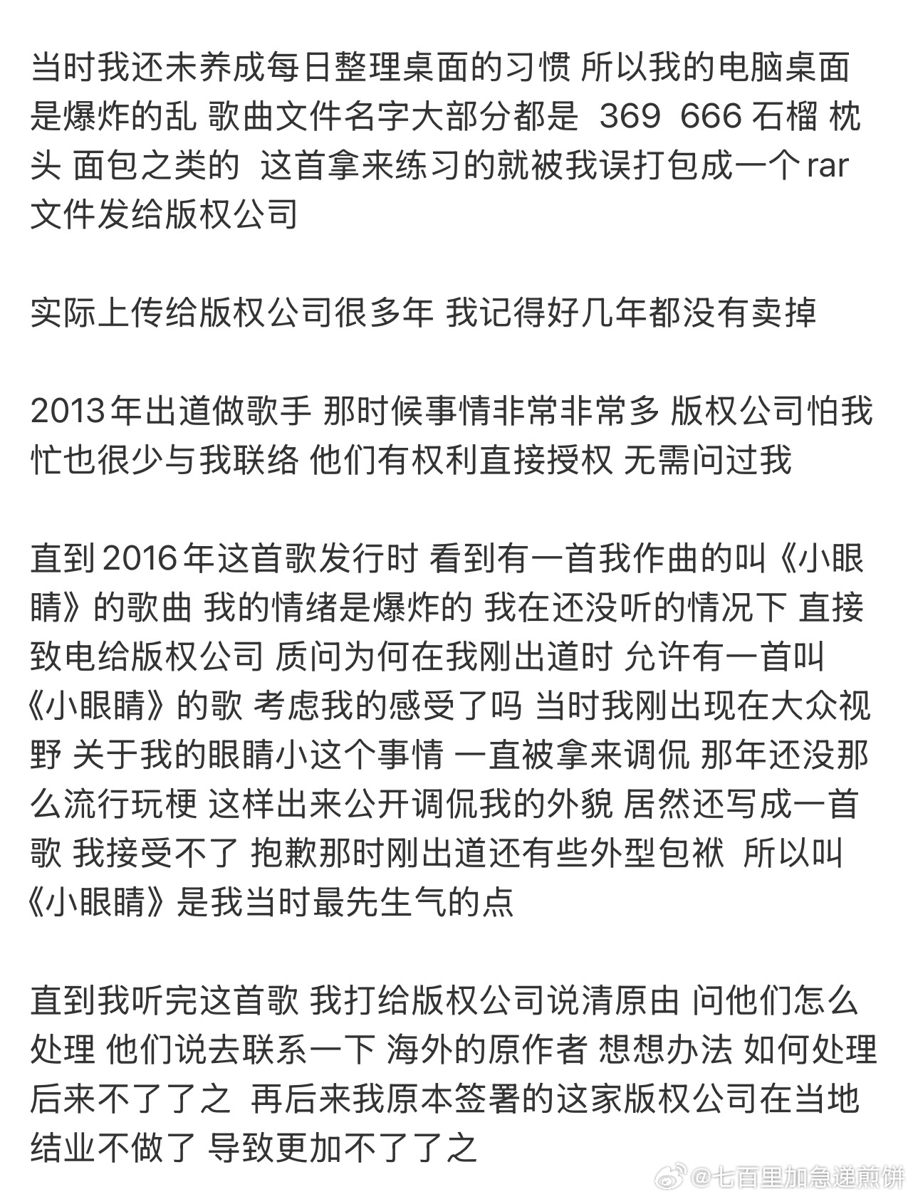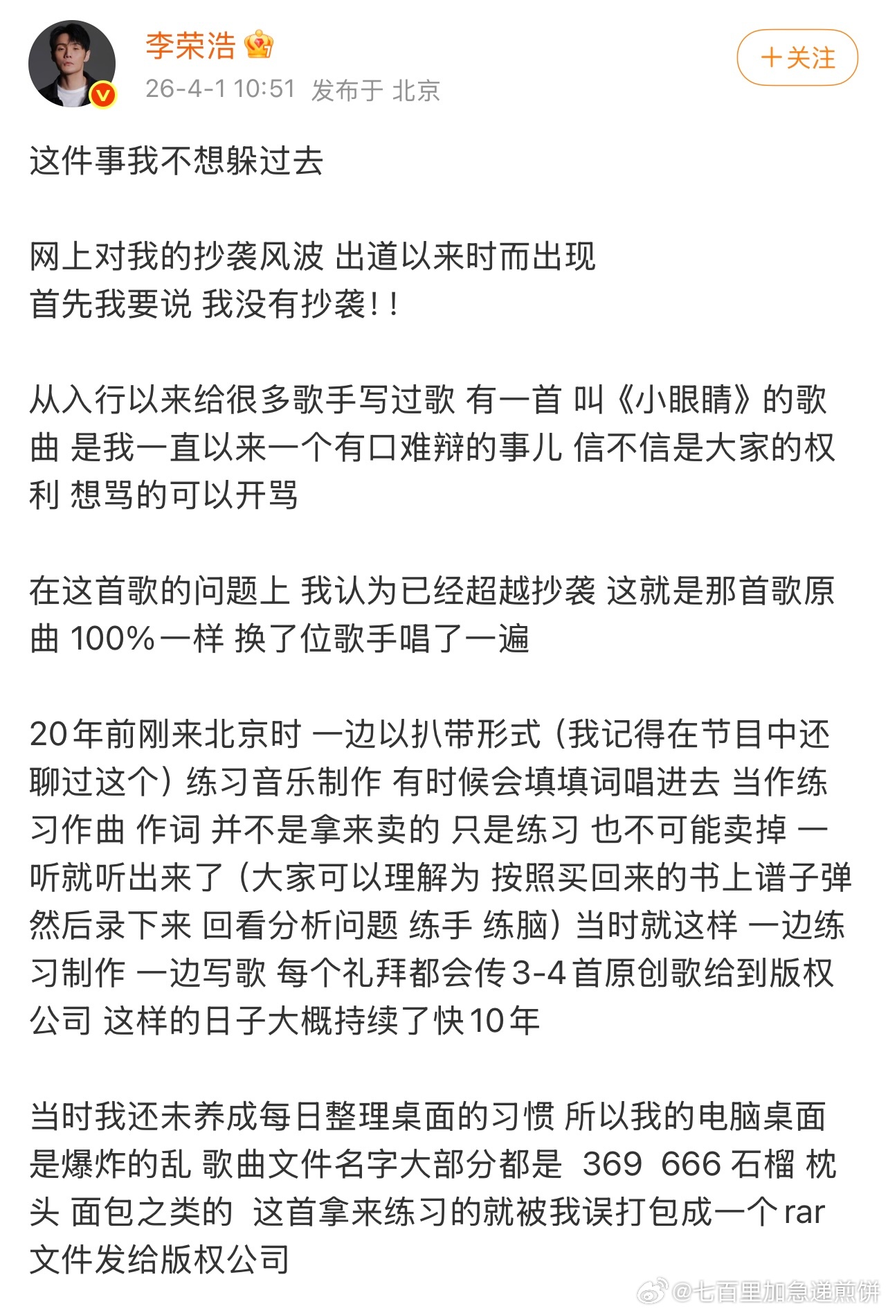 李荣浩又发长文了,他一个人就是自己的反黑否认自己抄袭,《小眼睛》这首歌是早期以扒