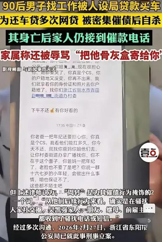 一位正值壮年的男人,被逼到在母亲墓前喝农药自杀!一个只想安稳开车的男人,被月入过万的招聘骗去贷款买车,14万的车背了19万债。 荒唐的是,他死后第5天,催收电话还在打,对方用方言骂他姐姐:“把他骨灰盒寄给你”。人都没了,这帮人连最后一点人性都不要了。 骗子把骗局拆成“招聘、购车、经营”三段,每个环节都披着合法外衣,单看都没毛病,连起来就是杀猪盘。晕头转向借出几万,吭吃瘪肚一年还了几万,发现最后还欠几万...这哪是借贷,是抢劫! 普通人找工作太难了!城里挣不到钱,农村回不去,稍微急一点就掉坑里。签合同前一定看清楚,让你先交钱,先贷款的,扭头就走。记住,天上不会掉馅饼,只会掉陷阱。 那些还在用爆通讯录,骚扰家人逼债的,等着吧。2026年新规利剑已出鞘,无牌平台,暴力催收的一个都跑不掉。希望吴凯强的悲剧,能换来更多人的警醒。