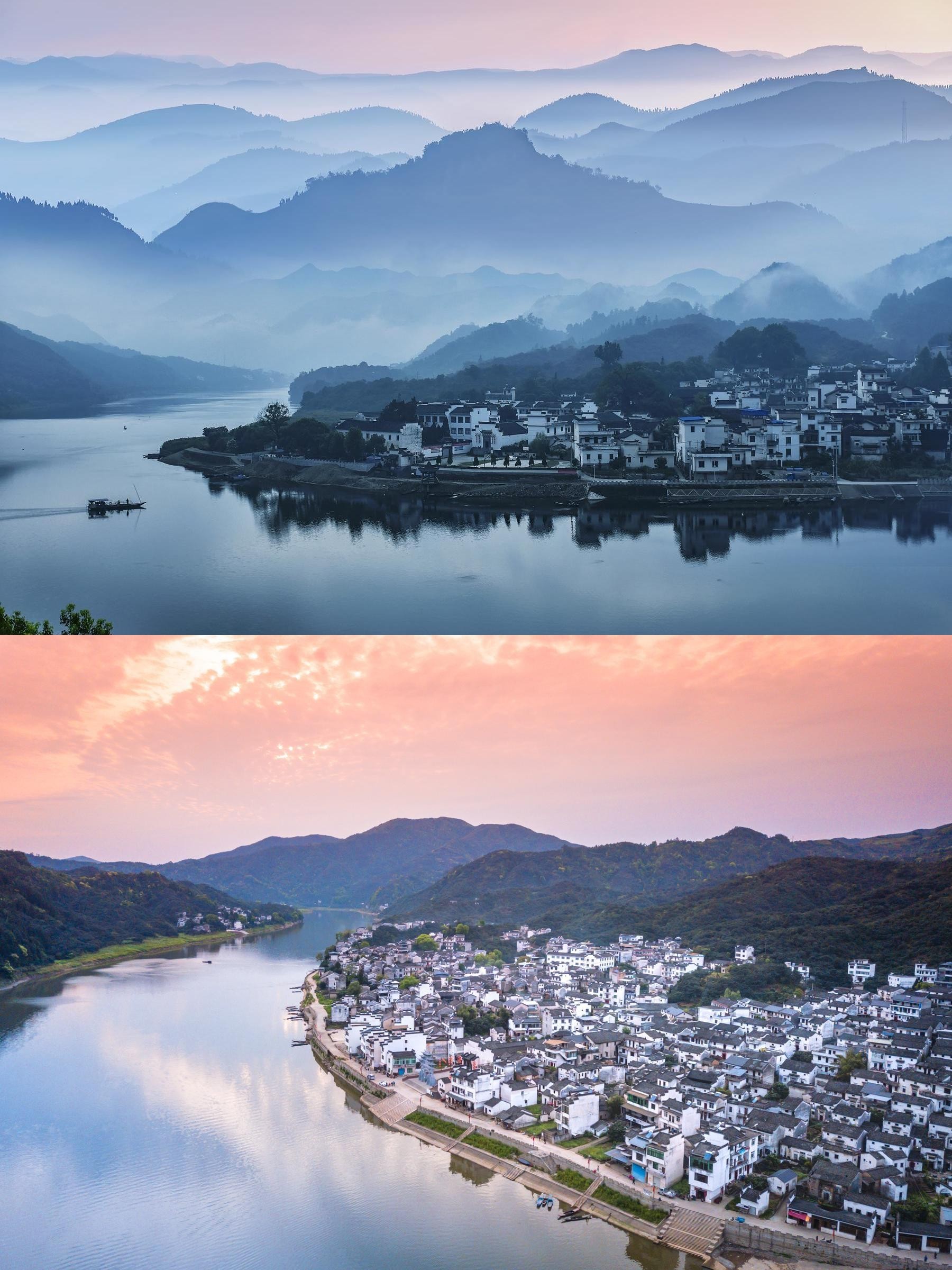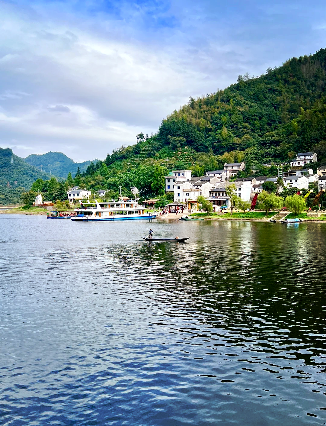 4️⃣.新安江山水画廊,乘船看两岸徽派村落,像一幅流动的水墨画。