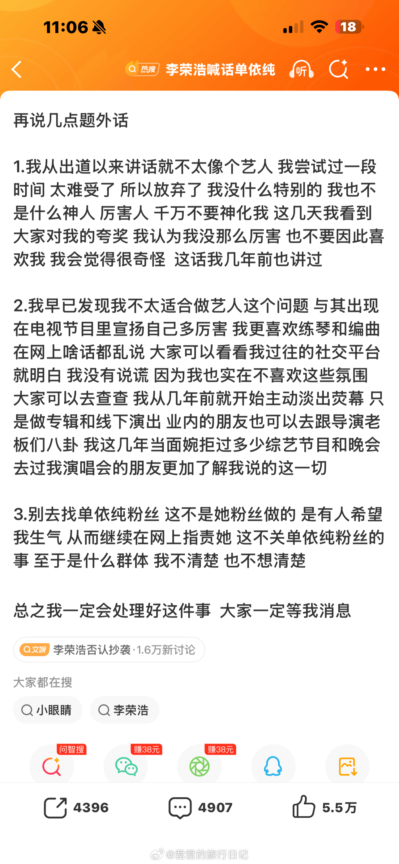 这事情跟单依纯粉丝无关,不要找他们。李荣浩说自己不适合当艺人,近年在淡出,只专注音乐本身。