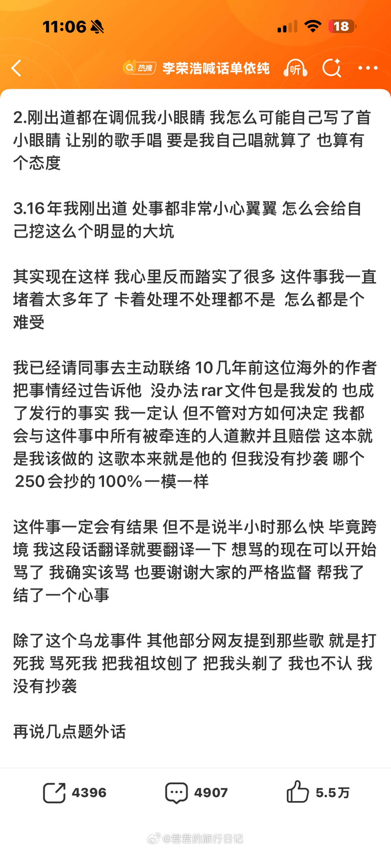 他表示自己没有抄袭,当时刚出道,练手扒带,误发给版权公司,对方擅自发行。自己很冤,但有责任,现在联系原作者,愿意道歉赔偿。