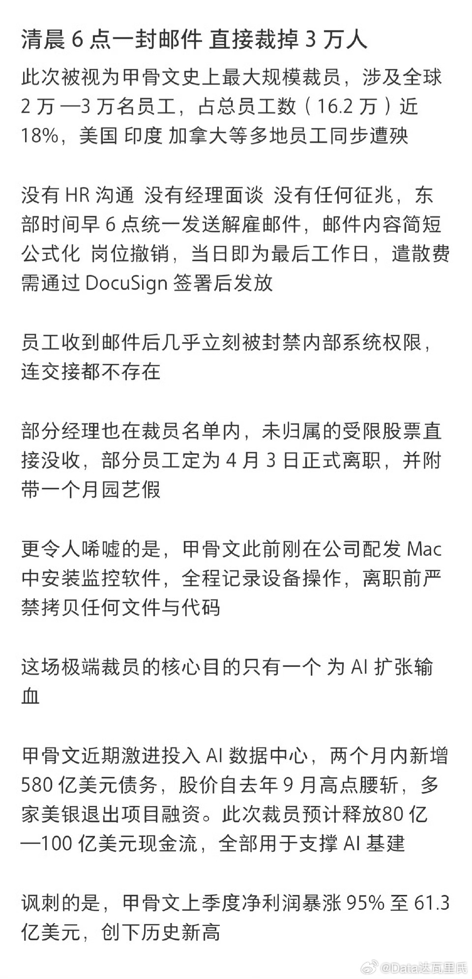 甲骨文凌晨6点突发裁员3万人突然就裁3万人……大资本国的资本家还是牛啊……是不是