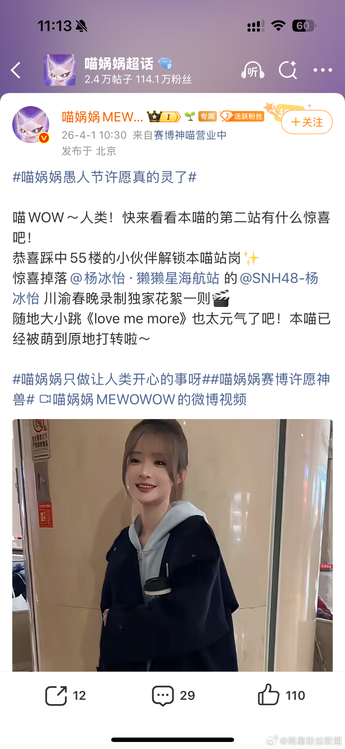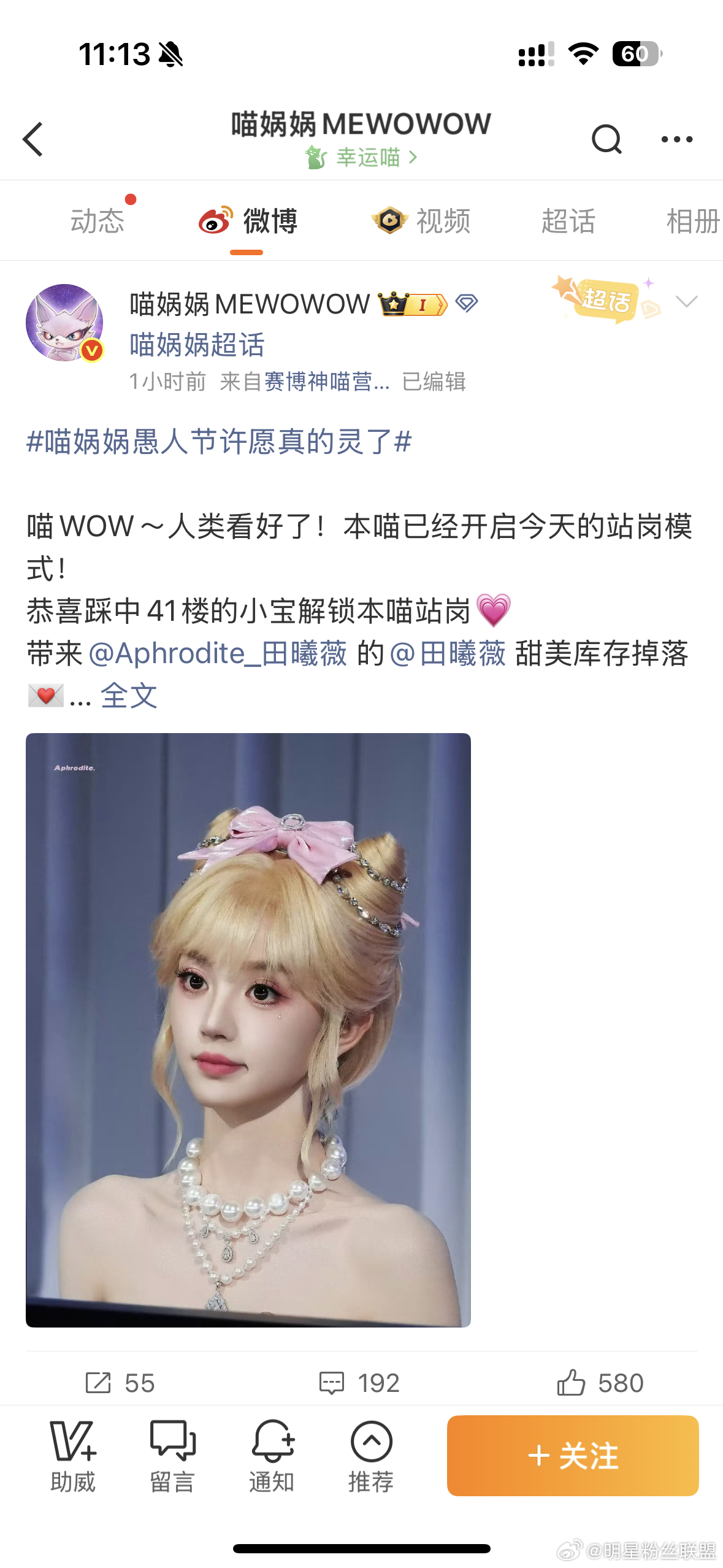 喵娲娲愚人节许愿真的灵了 愚人节到,喵小爱一日站长营业中!踩中许愿池楼层的幸运粉丝们已经陆续收到来自的站姐们的未公开神图👀📸喵小爱的神秘相册正在解锁中,下一个会是谁?