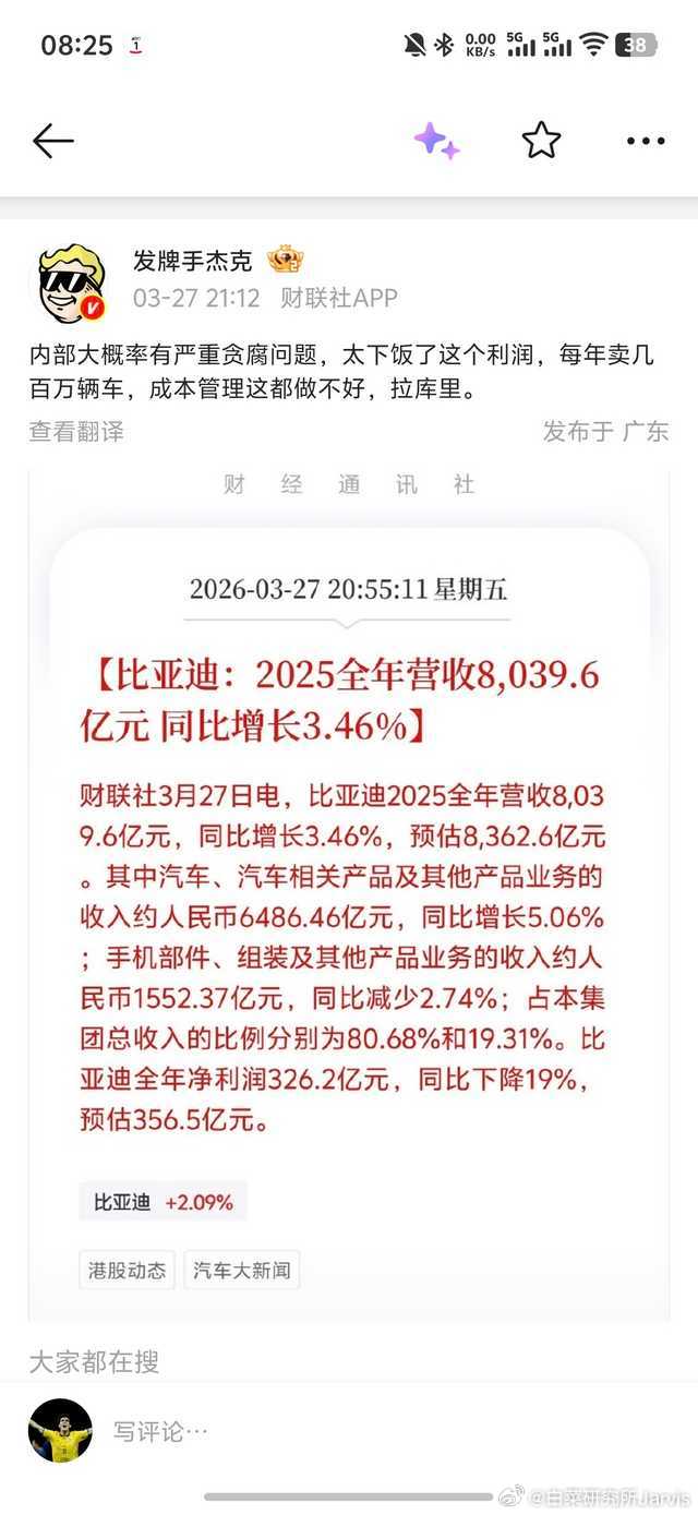 有些财经博主我还真没冤枉你们,比亚迪这个财报你都能说出净利润太低有贪腐?自己去做个桌面,把已经公布年报的车企拉出来做个单车利润排序,不就是什么都清楚了?