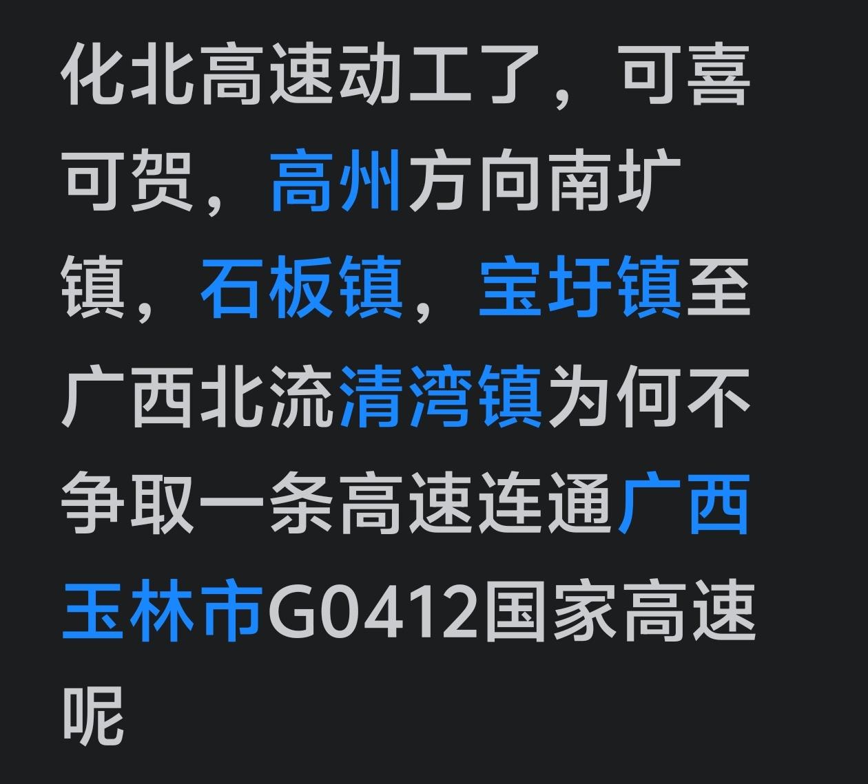 粤西茂名市人民心心念念的化北高速,与化州北部及高州西南部人民出行有什么的关联呢? 化北高速与深南高速(G0412)的关联详解 化北高速(化州至北流高速)和深南高速(G0412国家高速)有直接、紧密的关联,具体关系如下:   一、核心关联:化北高速是深南高速的关键组成部分 化北高速(广西北流-广东化州段)被明确为G0412深南高速的关键组成段,是深南高速粤桂省际衔接的核心通道之一: - 化北高速全长约62.2公里,双向四车道,设计时速120km/h,北起化州播扬镇(粤桂界),顺接广西北流段,向南贯穿化州北部,最终与汕湛高速相交。 ​ - 该线路是深南高速(深圳-南宁)在粤西地区的重要省际出省通道,承担着粤西对接广西北部湾、串联两广高速网的核心功能。 二、线路衔接与互通设计 1. 共线/衔接方案:深南高速粤桂省界段,通过与化北高速(北化高速)共线的方式实现顺接,最大化兼顾两广的路网利益,解决了省界接点的线位衔接问题。 ​ 2. 预留互通条件:化北高速在建设中,专门预留了与G0412深南高速的枢纽互通接口,未来深南高速茂名段(东西走向,贯穿电白、高州、化州)建成后,可直接与化北高速实现无缝衔接,形成“东西向深南主通道+南北向化北省际通道”的十字枢纽。 ​ 3. 走向互补: ​ - 深南高速茂名段为东西走向:东起电白那霍,西至化州平定(粤桂界),串联高州、化州东部/中部; ​ - 化北高速为南北走向:北起播扬(粤桂界),南至化州石湾,串联化州北部; 两条高速在化州境内形成十字交叉,共同构建粤西北部的高速骨架。 三、关于你提到的高州南圹、石板、宝圩至广西清湾的线路! 而高州的南圹、石板、宝圩→广西北流清湾镇的线路,正是深南高速(G0412)茂名段的核心走向: - 深南高速茂名段终点就设在化州平定镇(紧邻清湾镇),顺接广西玉林博白至高州(清湖段)的线路,直接连通广西玉林的G0412国家高速网。 ​ - 这条线路是深南高速的主线,和化北高速形成“一主一支、十字互通”的格局: ​ - 深南主线:东西向,覆盖高州、化州,直达广西清湾/玉林; ​ - 化北高速:南北向,覆盖化州北部,作为深南高速的省际补充通道,同时服务化州本地南北通勤。 ✅ 化北高速不是深南高速的主线,但属于深南高速的关键组成/配套通道,二者通过枢纽互通实现无缝衔接,共同构成粤西对接广西的高速网络。 ✅ 你提到的高州→广西清湾的线路,正是深南高速(G0412)的主线走向,未来将直接连通广西玉林的国家高速网,和化北高速形成互补,覆盖粤西不同片区的出行需求。 补充:两条高速的建设进度 - 化北高速:已全面动工,预计2028年通车; ​ - 深南高速茂名段:已完成前期工可、用地预审,计划2026年开工,2028-2029年建成!