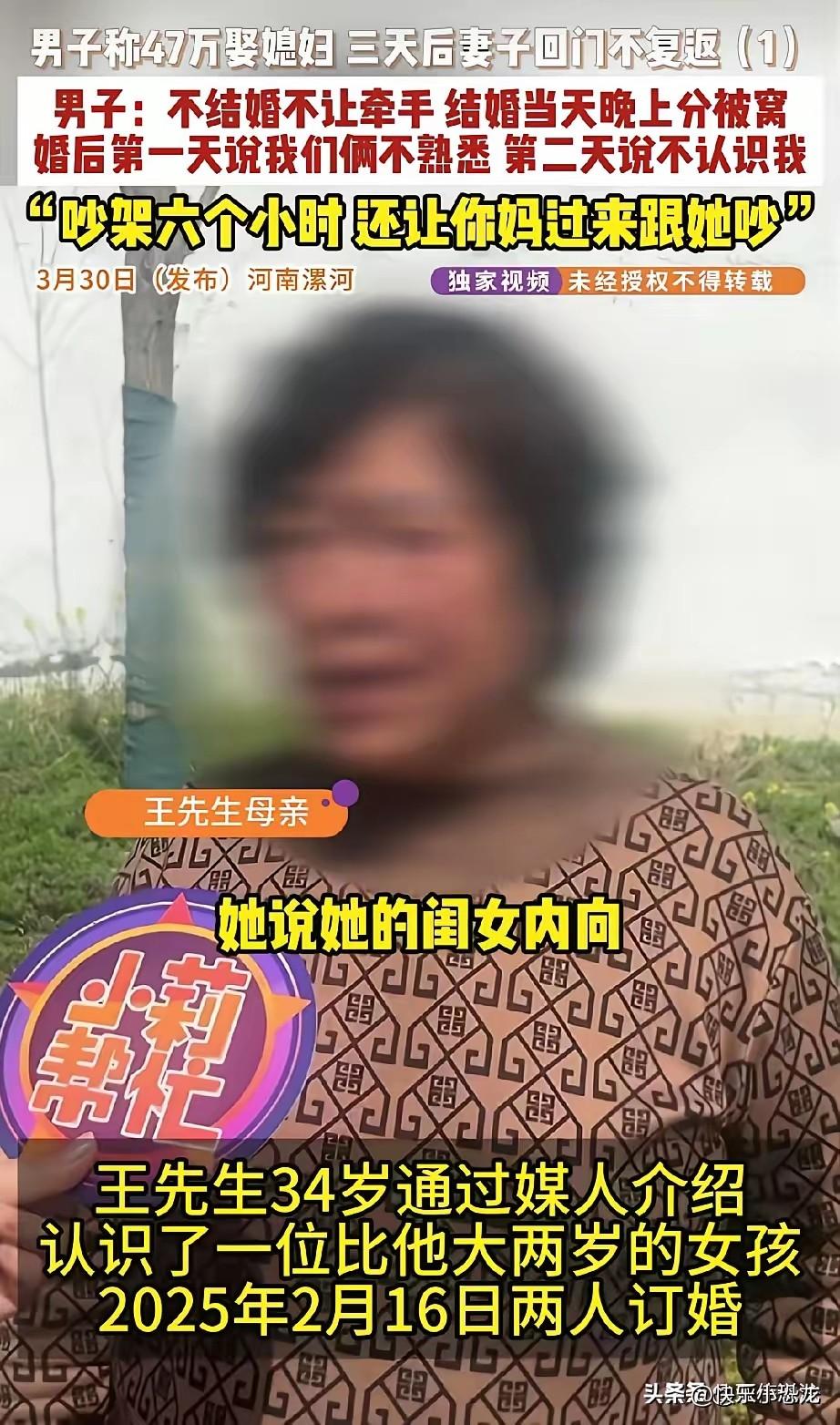 这种女人太可怕了!河南漯河,34岁男子经介绍结识大2岁女子,恋爱一年领证结婚,男方倾尽所有给40万彩礼,外加7万多花销。新婚夜女方竟要求分被睡,称两人不熟,后续始终拒绝亲近,回门时借机直接消失,男子要彩礼还被拒,这场婚姻简直就是一场算计! 男子为了这场婚事,把自己多年攒下的血汗钱全拿了出来,还跟亲戚朋友借了不少钱,满心想着婚后能好好过日子,没想到从结婚第一天起,女方就处处冷淡,不让碰、不亲近,最后干脆在回门时偷偷跑了,连面都不露。 男子急得团团转,上门找女方要回彩礼,可女方就是不肯退钱,把钱攥得死死的,完全不管男方家里的难处。 这种事在生活里真的不少见,不是只有这一家倒霉。 之前好多地方都发生过类似的情况,男方给了彩礼,女方结婚后要么不回家,要么直接跑了,钱也不退,让男方人财两空。 这些人把婚姻当成了赚钱的路子,根本不是真心想过日子,把好好的感情变成了一场骗局。 说到底,还是有些人把彩礼看得太重,把婚姻当成了交易。 结婚本来是两个人互相扶持、好好过日子的事,可现在有些人只想着钱,不考虑感情,也不承担责任。 这种做法不仅伤了真心想结婚的人,还破坏了大家对婚姻的信任,让很多人不敢轻易结婚。 婚姻不是买卖,彩礼也不该是用来赚钱的工具。两个人在一起,最重要的是真心相待、互相尊重。只有真心过日子,才能有幸福的生活,靠算计得来的钱,最后只会让自己失去更多。 各位读者你们怎么看?欢迎在评论区讨论。