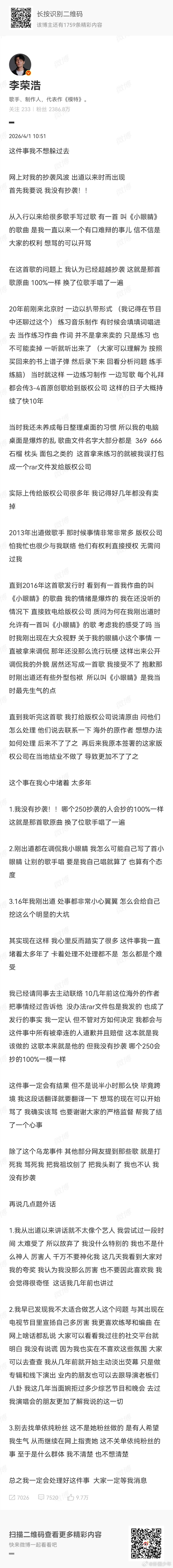 李荣浩除了小眼睛其他歌没抄袭李荣浩用的是九宫格还是26健针对抄袭质疑,李荣浩在线发声澄清,快速发布长文且错字极少,网友纷纷猜测其打字键盘类型。