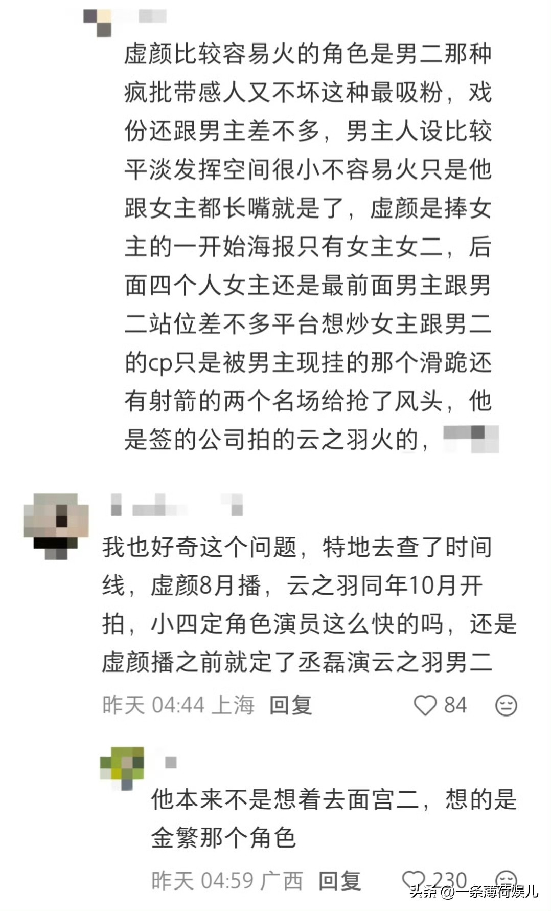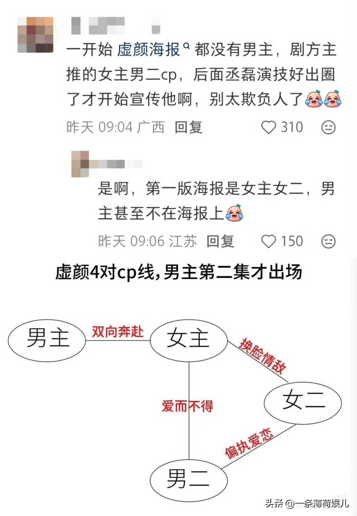 虚颜一开始主推的是女主和男二,官方当初鼓励的二创方向就是换乘,女二,男二,女主三人互相纠葛,男主就是工具人,故事线很单薄,不过最后还是火了丞磊自己现挂的滑跪名场面。