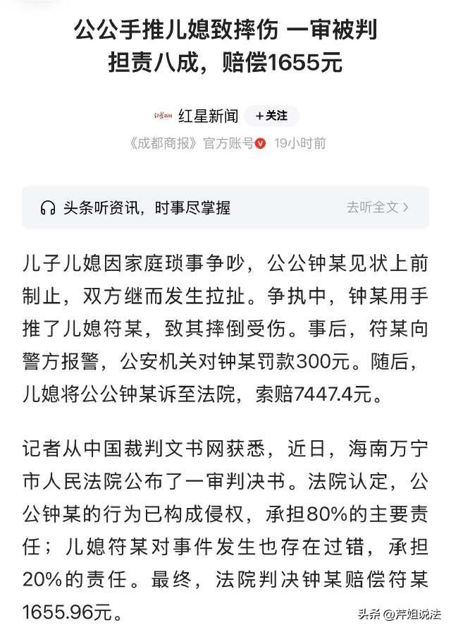 海南万宁,一女子跟丈夫因为家庭琐事吵架,女子当时正在气头上,把厨房里的锅碗瓢盆全都砸个稀巴烂。正在房间里睡觉的公公被吵醒,赶紧过来查看情况,老爷子本来是好意要制止,让夫妻二人不要再争执了,但是根本劝不住,儿媳妇一个劲的摔东西搞破坏。老爷子就上去拉扯住二人,一个不小心推搡了儿媳妇,导致女子摔倒受伤。 红星新闻3月31日报道了这则新闻。 要说儿媳妇摔的可不轻,头顶也破了、手臂也挫伤了、臀位也受伤了,这下,儿媳妇气的立刻就报了警。 事件发生于一个普通的农村自建房内,一个寻常的午后,老人家钟某在自己的房间里睡觉。 突然,钟某就被外面的一阵吵闹声给惊醒了。 原来,是自己的儿媳妇跟儿子在吵架。 当时因为家庭琐事,儿媳妇符某在跟丈夫小钟发脾气,其实夫妻俩吵架,各种对与错,清官都难断家务事呢。这个时候老爷子自己只管睡觉就行,非要起来管闲事。 符某正在气头上呢,拿起厨房的铁锅,就朝着丈夫砸去。 而丈夫也丝毫不甘示弱,仍然继续跟妻子争吵,根本就不想礼让。 符某看到丈夫还不服软,就把厨房里的铁锅啊、瓢盆碗等器具,一股脑的全都朝着丈夫小钟砸去。 瞬间,厨房里伴随着“哐啷”的声音,厨具就被洒落的一地。 站在厨房门口的钟某,也实在是忍不了了,这不就是浪费嘛。但是他还是理性的先上前制止,让儿媳妇消消气,之后又去劝解自己的儿子。 可是眼面前的这俩人,根本不听劝,也根本拉不住,仍然在争执,甚至起了肢体冲突。 老爷子见状,心想:他俩人要是打起来,没个轻重的,后果不堪设想。 钟某也赶紧上前阻止,就在拉扯的过程中,一不小心推搡了儿媳妇符某一把,力道还挺大,符某一下子就摔倒在地。 看到符某摔跤了,父子俩都傻眼了,而且符某伤势还不轻,头部开始肿胀,并且还有淤青,手臂、臀位都有不同程度的挫伤。 丈夫看到情况不妙,赶紧就拨打了救助电话。 而符某不甘心,她感觉就是公公故意针对她,趁她不注意,故意将她推倒受伤。因此,符某又打电话报了警。 符某被丈夫他们先给送去救治,入院之后,医生给出的诊断鉴定:符某属于人体损伤,但是尚未构成轻微伤。 办案人员过来之后,根据这个医疗诊断报告,先对钟某出具了《行政处罚决定书》,并且处罚钟某300元。 面对这个判定,符某还是不服气,就把钟某给上诉了,她认为就是公公恶意推搡,这才导致她受伤了,要求钟某赔偿医疗费、误工费、护理费、精神费合计7447元。 但是钟某也感觉很冤枉,因为当时他只是过来劝架,让儿媳妇不要摔东西了,并没有殴打符某,所以他不同意赔偿。 对此,相关部门会怎么判定呢? 根据《民典法》规定,行为人侵害他人的合法权益,法律会保护受害者的生命健康权。 当公公的行为已经构成了侵权,推倒儿媳导致对方受伤,就需要承担相应的法律责任,这个侵权行为要面临行政处罚,并且还需要承担民事赔偿责任。 相关部门认为,生命健康权受到法律保护,儿子跟儿媳妇因为家庭琐事争吵,之后女子摔东西,公公来制止,大家都在气头上,都无法冷静处理。 公公的意外推搡,导致了事故发生。虽然符某受伤,但是她自己也存在一定的过错。 最后认定,钟某承担80%的民事责任,符某自己承担20%的责任,钟某需要赔偿1655元给到儿媳妇。 所幸,符某的伤情尚且不构成轻微伤,根据《刑法》规定,如果行为造成他人轻微伤以上伤情,可能构成故意伤害罪,还需要承担刑事责任。 这是一份家庭矛盾纠纷,最后的判定体现了“过错责任原则”和“过失相抵规则”的结合,既保护了受害人的健康权,也警示家庭成员之间应该依法处理纠纷,而不是言语相对、或者肢体冲突。 不管亲属关系如何,任何人也不可以使用暴力去解决家庭矛盾,家庭成员之间的相处,也需要互相理解,而不是一言不合就动粗。 闹到最后,说白了都是一家人,里外都不好看,最后邻居看笑话。 对此,您怎么看呢,不妨评论区留言一起来讨论吧。