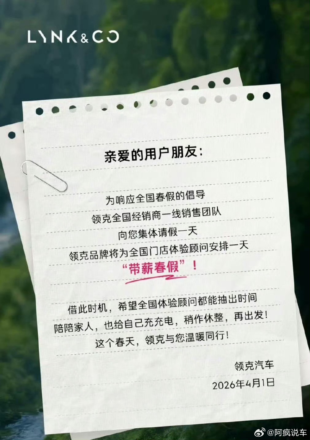 领克宣布全国销售放1天春假