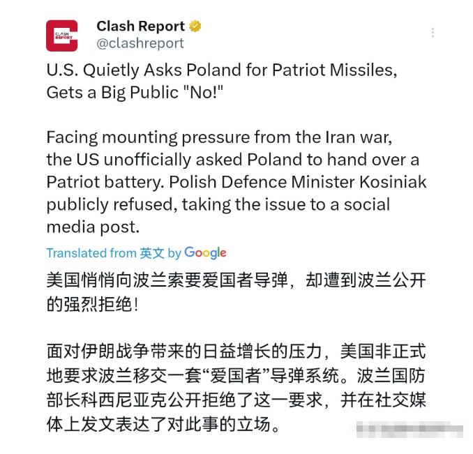 太尴尬了!美国脸上怕是挂不住了!波兰公开拒绝美国! 3月31日,根据外媒报道,外媒称,美国私下向波兰索要“爱国者”导弹,结果遭到公开强硬拒绝。面对伊朗局势带来的日益加剧的压力,美国非正式请求波兰移交一套“爱国者”防空导弹系统。波兰国防部长科西尼亚克公开在社交媒体发文,直接回绝了此事。 以往美国一声令下,欧洲小弟们哪个不是乖乖听话,要钱给钱、要装备给装备?可如今呢,连一套防空导弹都要不来,还被当众打脸,这老脸往哪儿搁啊。 这说明什么呢?这说明美国的霸权号召力,正在肉眼可见地崩塌。波兰这次拒绝,也不是一时冲动,而是欧洲盟友对美国态度转变的一个信号。美国这些年到处打仗,军费开支大得吓人,可真正能用的家底却越来越薄。 冷战结束后,美国把军工企业整合成了几家大公司,平时为了省钱,都不怎么囤货,订单来了才生产。这种精打细算的做法,平时看着挺聪明,一到打仗就抓瞎了。生产线不是说开就能开的,工人不是说招就能招的,等一切准备好,仗早就打完了。 美国现在陷入了恶性循环:仗打得越多,弹药消耗越快;消耗得越快,就越需要找盟友帮忙;可盟友看到美国这么狼狈,心里也开始打鼓——你连自己都顾不过来,还能保护我们吗?波兰的拒绝就像一面镜子,照出了美国霸权的尴尬现状。 这种“拆东墙补西墙”的做法已经引起了连锁反应。美国为了打伊朗,不仅想动波兰的“爱国者”,还打算把原本要给乌克兰的防空导弹调往中东。这下乌克兰不干了,泽连斯基急得直跳脚,说这是“生命问题”。 乌克兰每个月至少需要60枚“爱国者”拦截弹才能挡住俄罗斯的导弹,美国要是把弹药都调去中东,乌克兰怎么办? 美国现在真是左右为难。中东的仗不能停,乌克兰的援助也不能断,可自家的弹药库已经见底了。找盟友帮忙吧,像波兰这样的前线国家首先考虑的是自身安全;像德国、法国这些西欧国家,也对美国的中东政策有意见,有的甚至禁止美国使用其领空和基地对伊朗采取军事行动。美国这个“世界警察”,突然发现手下的小弟们都不太听话了。 波兰这次公开拒绝,就像一记响亮的耳光,打醒了还沉浸在霸权梦里的美国。时代变了,美国再也不能像过去那样,对盟友召之即来、挥之即去了。当美国自己都捉襟见肘的时候,盟友自然会打起自己的算盘。 波兰的“爱国者”导弹,终究是要用来保卫波兰的天空,而不是替美国的中东战争填坑。这个道理,波兰懂,其他欧洲国家也懂,只有美国自己还没完全明白。