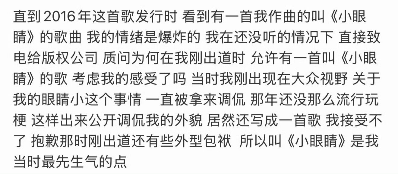 李荣浩真的很在意别人说他眼睛小李荣浩否认抄袭一直以为李荣浩对眼睛小这个梗早就释怀了,平时又自嘲又玩梗,看着特别豁达。直到这次回应抄袭争议他才说出心里话,刚出道一直被人拿眼睛调侃,他根本不可能写一首叫《小眼睛》的歌,情绪都特别激动。原来那些云淡风轻的玩笑,都只是他藏起委屈的样子。