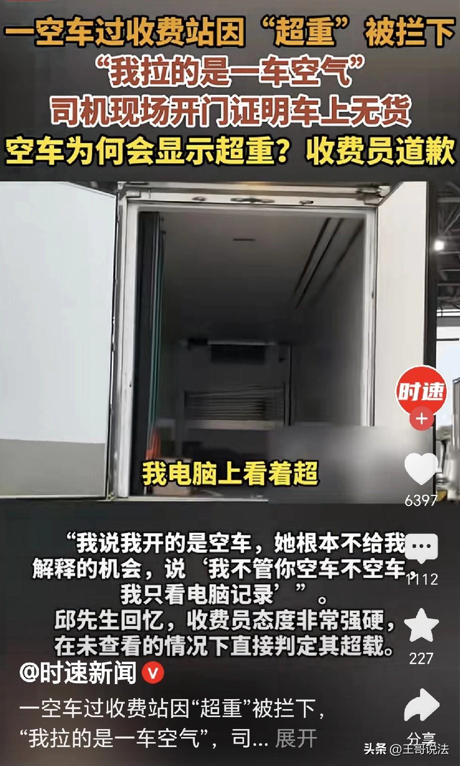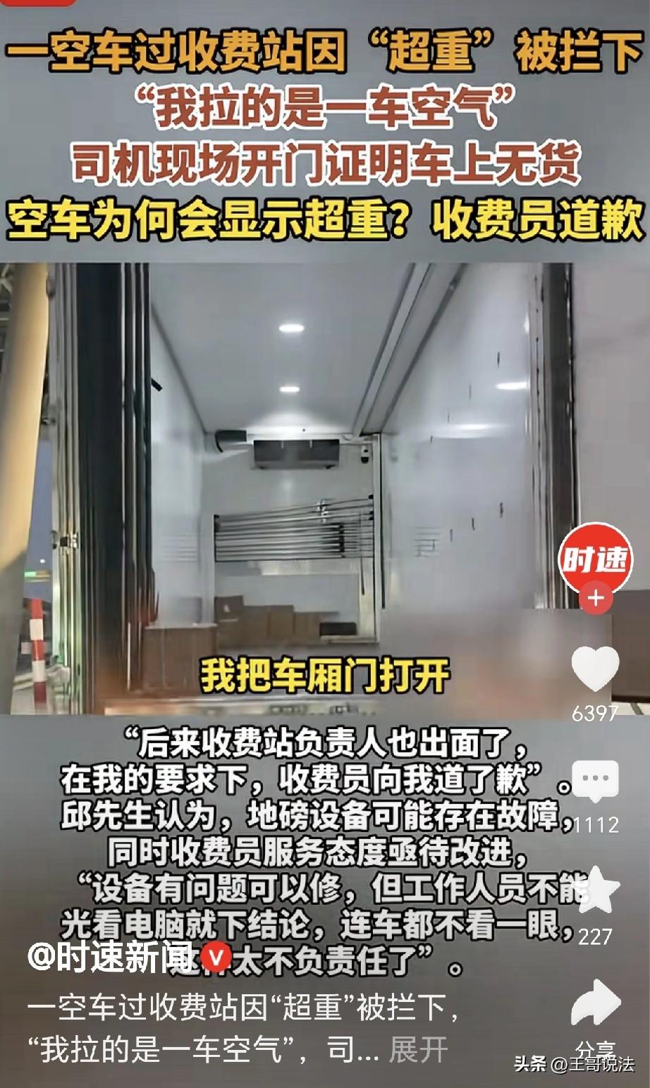 上海,一男子开了辆空车过收费站,谁知收费员说他超重,要他倒回去,司机懵了,赶忙说自己开的是空车,可对方不听解释: 我不管你空车不空车,我只看电脑记录!男子气的一肚子火,立刻下车打开了车门: 我拉了一车空气!收费员一看,车里果然是空的,她拍了照片,态度也变了,负责人赶来,男子要求道歉: 不能光看电脑就下结论,连车都不看一眼,如果我车上装着货物,那就说不清了! 邱师傅最近遇上了件离谱事,气得他憋了一肚子气。 3月26号下午,邱师傅开着空货车从某公路收费站过,结果刚到收费口,就被收费员喊住了:“你这车超重了,赶紧倒回去!” 邱师傅当时就懵了,自己明明开的是辆空车,车厢里没装货物,怎么可能会超重呢? 他赶忙向收费员解释: 我这是空车啊,不可能超重! 可收费员头都没抬,只是盯着电脑屏幕,她态度强硬:“我不管你空车不空车,我只看电脑记录!” 这话直接把邱师傅气的冒火,他跑货运这么长的时间,还是头回遇上这样的事情。 “我拉的是一车空气,难道空气还能超重?” 邱师傅越想越气,干脆把车停在原地,他要证明自己的话,他拉开车门就跳了下去。 他绕到了车后,二话不说,“哐当”一声拉开了车厢门。 收费员一看,这才绕到车后观看,一看傻眼,邱师傅说的是真的,车里是空的,压根啥都没装。 收费员拍了照片,态度瞬间变了,可邱师傅心里生气,我给你说了车是空的,你最起码要看完后再下结论吧! 这时,负责人也赶了过来,一看这种情况,确实是收费员的不对。 在邱师傅的要求下,收费员给他道歉。 可邱师傅心里窝火,你现在道歉了,刚才还说只看电脑那! 电脑虽然精密,但也毕竟只是个机器,它也会有出错的时候, 邱先生认为,出现这样的错误,地磅也有可能存在故障。 可收费员态度强 硬,看都不看一眼车辆,直接就说自己超重,这服务态度恐怕要改进改进了。 邱先生表示,设备有问题可以修,但工作人员不能光看电脑就下结论。 连车都不看一眼,这样太不负责任了,如果我车上装着货物,那就说不清了。 为何收费站会出现错误,将空车判为成超重,那么在这之前,有没有发生过相似的事情? 记者联系了收费站运营方,对方还没给出任何回应。 在这件事里,收费员态度强 硬: 口口声声不管空车不空车,她只看电脑记录,这让邱先生十分的无语。 空车超重这么明显的错误,但凡抬头看一眼都不会犯,可人家连解释都不听,一句“只看电脑记录”就把司机怼了回去。 设备出故障能理解,但工作人员连最基本的核实都懒得做,邱师傅较真要道歉,是为自己的清 白讨要说法。 《收费公路管理条例》第28条规定,收费人员应当按照规定和标准收取车辆通行费,对涉嫌超重的车辆应当进行现场核实。 收费员仅依据电脑数据就判定空车超重,未履行现场核实义务,违反了条例规定。 收费站作为运营方,应加强人员培训,规范操作流程,避免这种类似的误判再次发生。 司机在发现被误判时,有权提出异议,维护自身合法权益。 对此,你怎么看?