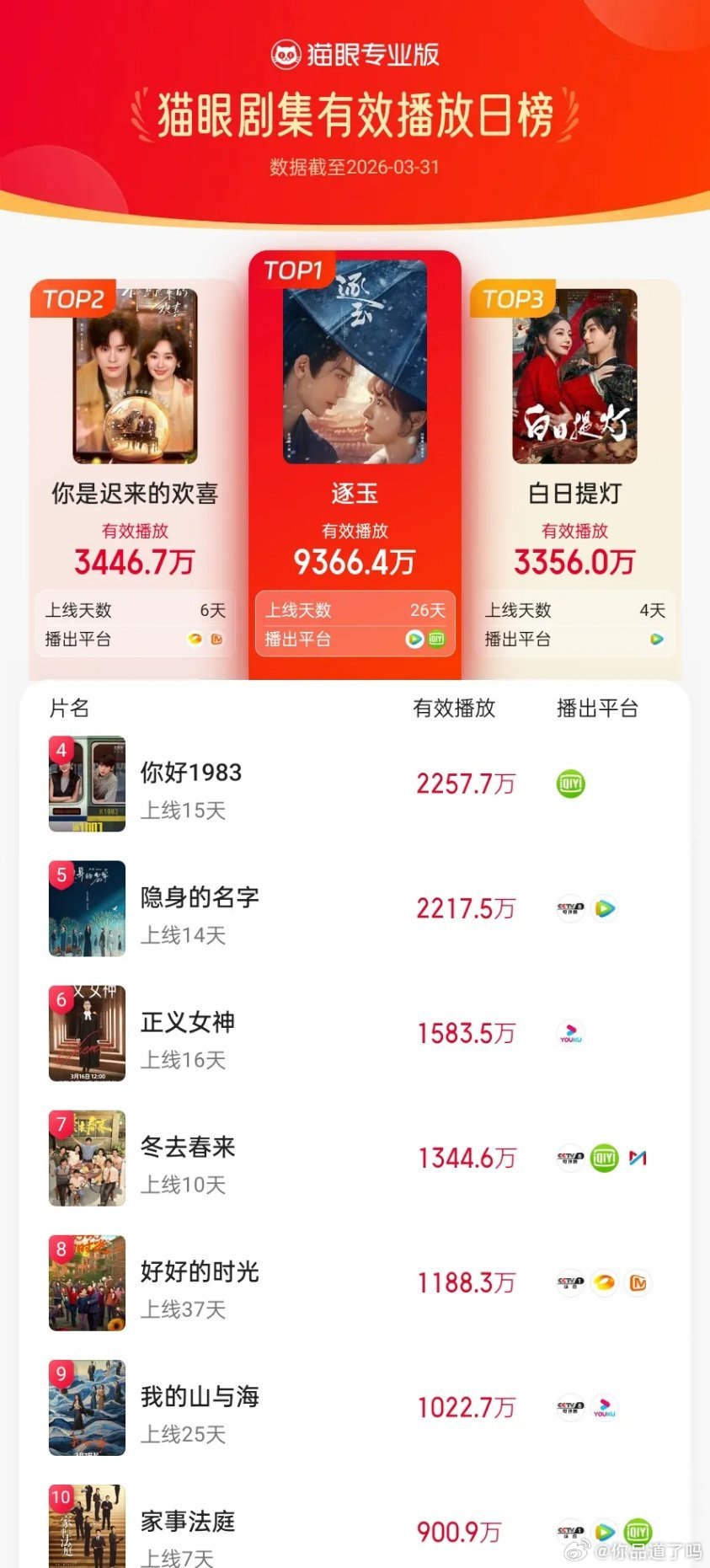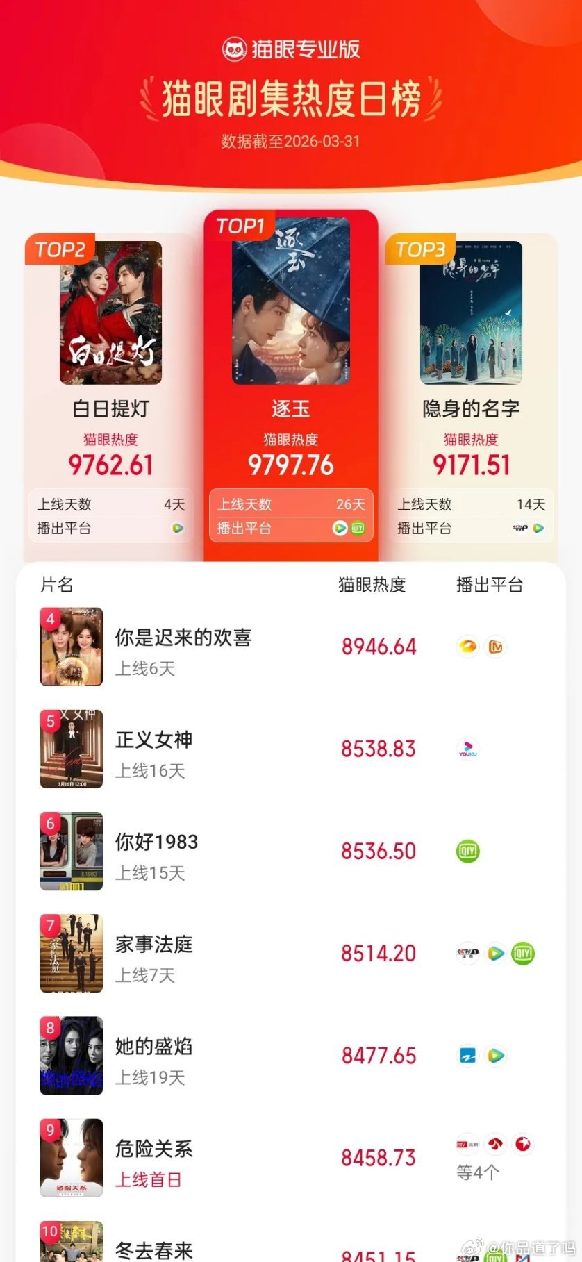 近期多部剧集表现各有亮点,呈现出不同的播出态势:《逐玉》作为古装古偶,在双平台实现热度破万并持续霸榜,尽显网播强势,但收视约0.5,属于典型的“网强台弱”;迪丽热巴的新剧开播4天热度达9762,顶流号召力凸显,网播表现亮眼。《危险关系》聚焦PUA与情感操控题材,虽差评不少,但热度稳定在第9位,以争议性话题维持着关注度。该剧作为《不要和陌生人说话》编剧的新作,孙俪饰演的心理学讲师从清醒到破碎再觉醒,破碎感演技张力十足,吴慷仁塑造的斯文败类精神科医生,以“温柔刀”式操控展现带感演技,成为其重要看点。而《冬去春来》这部年代北漂剧,在央视创下破2的收视成绩,峰值达3.17%,但网播热度一般,是“台强网弱”的代表;女性悬疑剧《隐身的名字》同样表现稳健,央视收视维持在1.6–1.8%,腾讯热度也突破2万+,实现了台网双稳。这些剧集的不同表现,也折射出当下“台强网弱”“网强台弱”“顶流破局”“争议热度”等多元的台网播出现状。