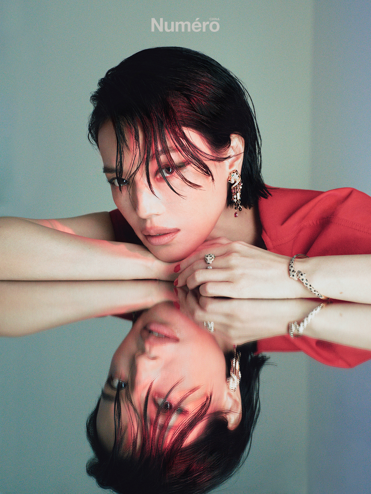 舒淇齐耳短发舒淇以利落齐耳短发亮相Numéro新刊,湿发造型冷艳凌厉,镜中倒影与珠宝加持,尽显松弛又高级的女性力量。
