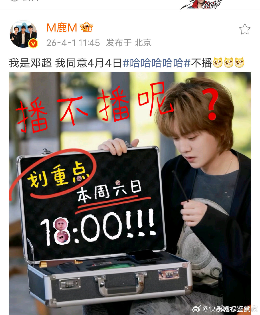 鹿晗说我是邓超我同意五哈不播鹿晗愚人节发博 鹿晗也加入邓超的闹剧了,发微博说我是邓超我同意五哈不播。这俩人愚人节组团来骗人,一个假装延期,一个假装替邓超同意。但不管今天是鹿晗还是邓超,五哈四月四号必须播,没商量