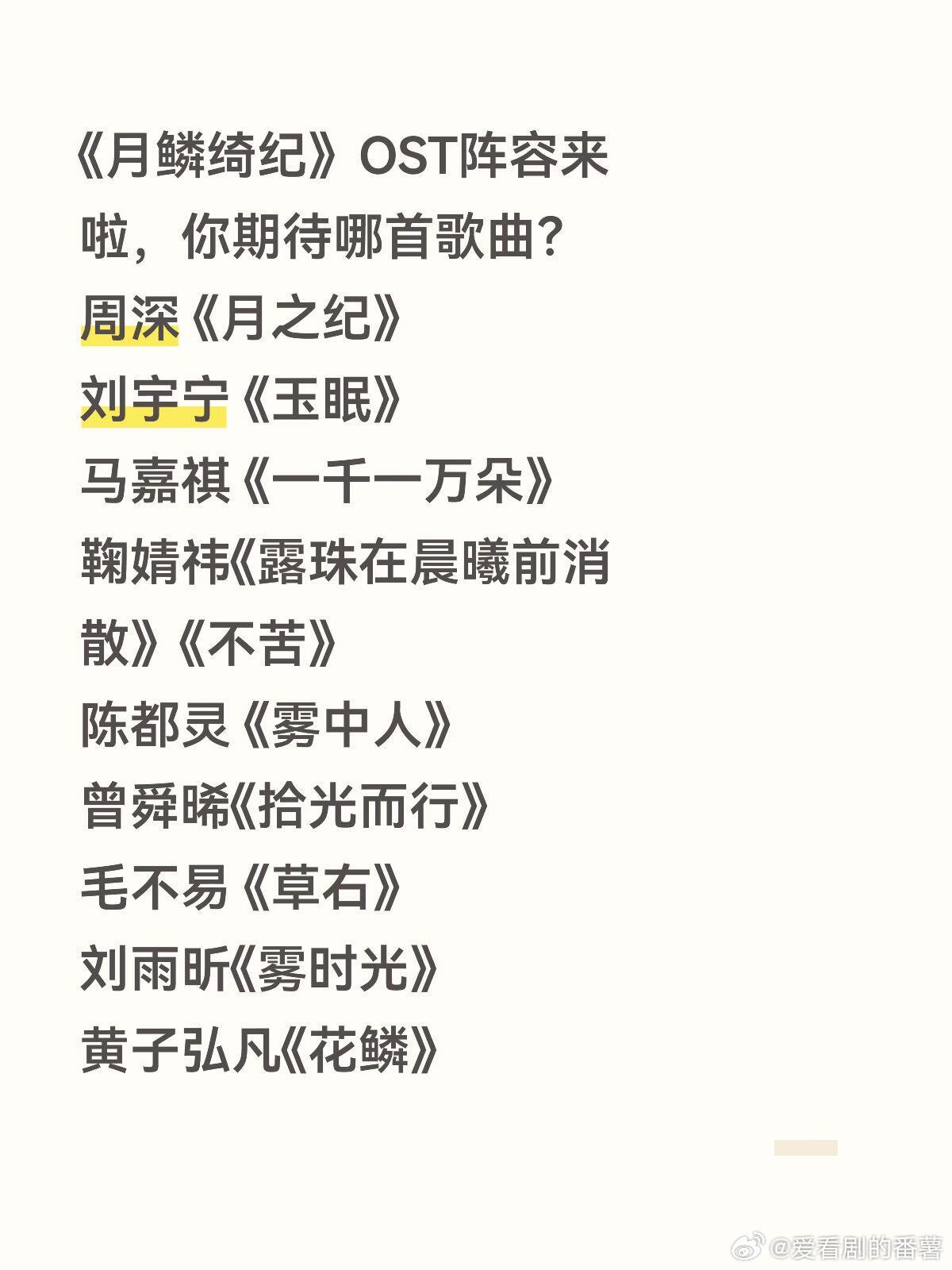 《月鳞绮纪》OST阵容来啦,你期待哪首歌曲?周深 《月之纪》刘宇宁 《玉眠》马嘉祺 《一千一万朵》鞠婧祎《露珠在晨曦前消散》《不苦》陈都灵 《雾中人》曾舜晞《拾光而行》毛不易 《草右》刘雨昕《雾时光》黄子弘凡《花鳞》刘宇 《除夕快乐无灾无祸》田嘉瑞 《赤子如狐》《不苦》闫桉 《无量尘》《黑白者说》