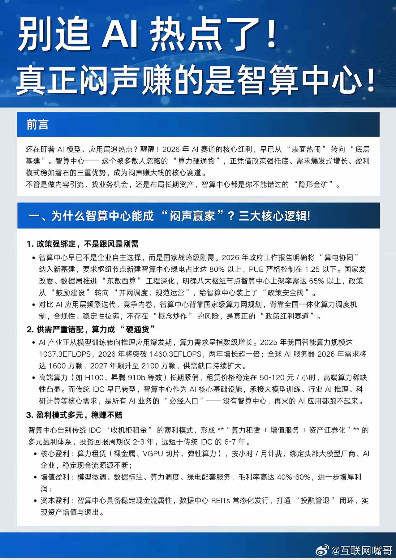别追 AI 热点了!真正闷声赚大钱的,是智算中心!大家都在追 AI 大模型、AI 应用,看着热闹,其实内卷严重、死得快。但所有 AI 的背后,都离不开算力。智算中心,就是给 AI 供能的超级算力工厂。AI 越火,算力越缺,它就越赚,妥妥的 AI 时代卖水人。大模型训练、自动驾驶、算力租赁,全是高净值客户。别看它重资产,只要算力满负荷,利润非常稳。风口天天换,算力永远是刚需。别再追昙花一现的热点了,智算中心才是长期稳赚的硬赛道!