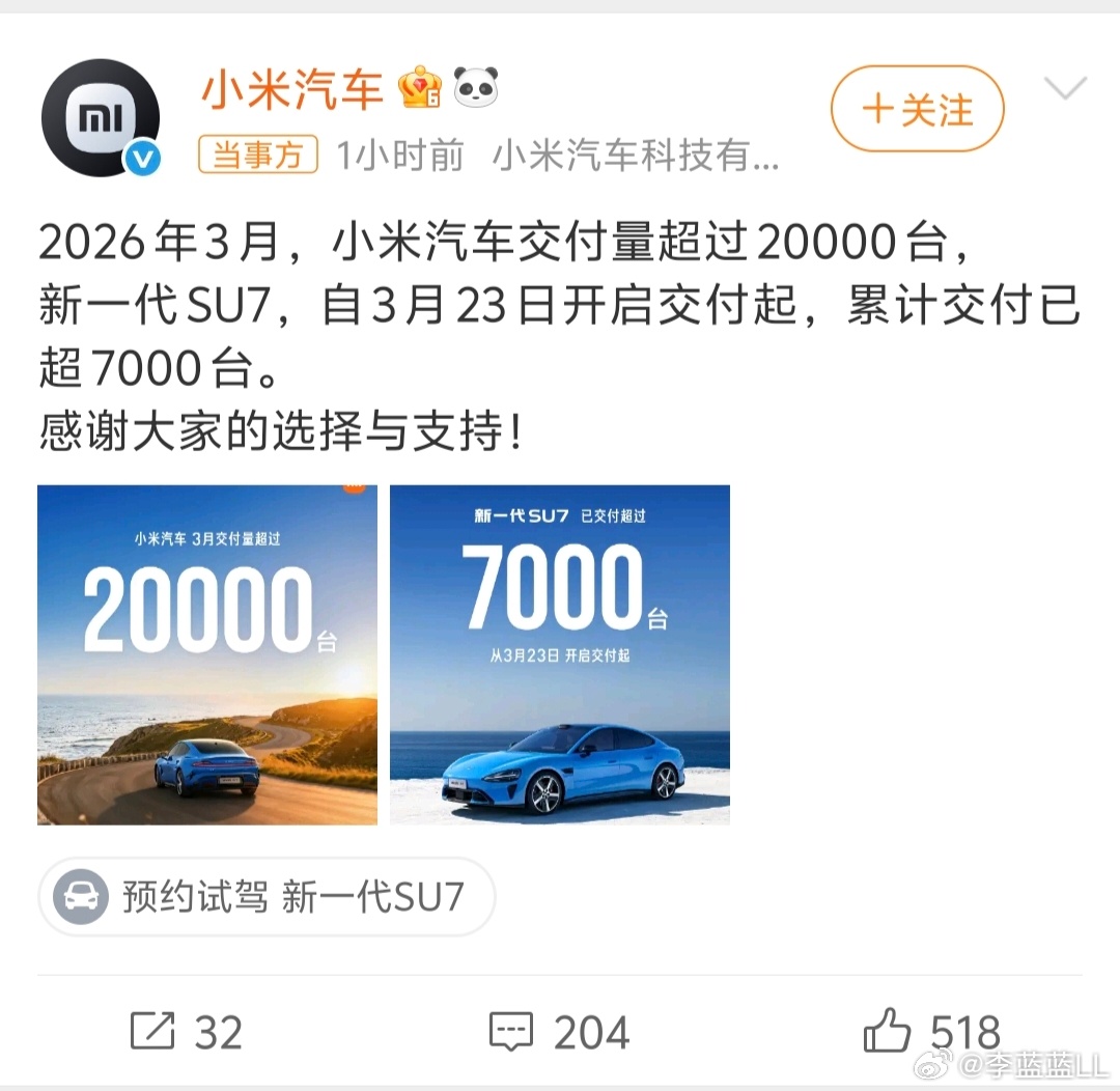 新一代su7累计交付超7000台这个交付数据怎么样?