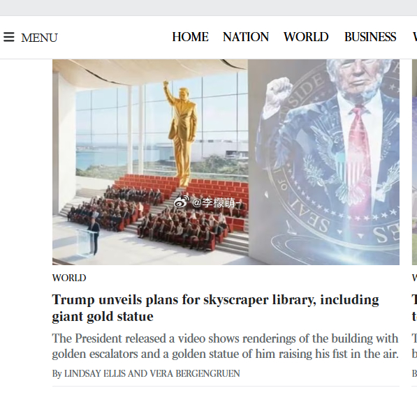 川普公布摩天大楼图书馆计划,其中包括一座巨型金色川普雕像。