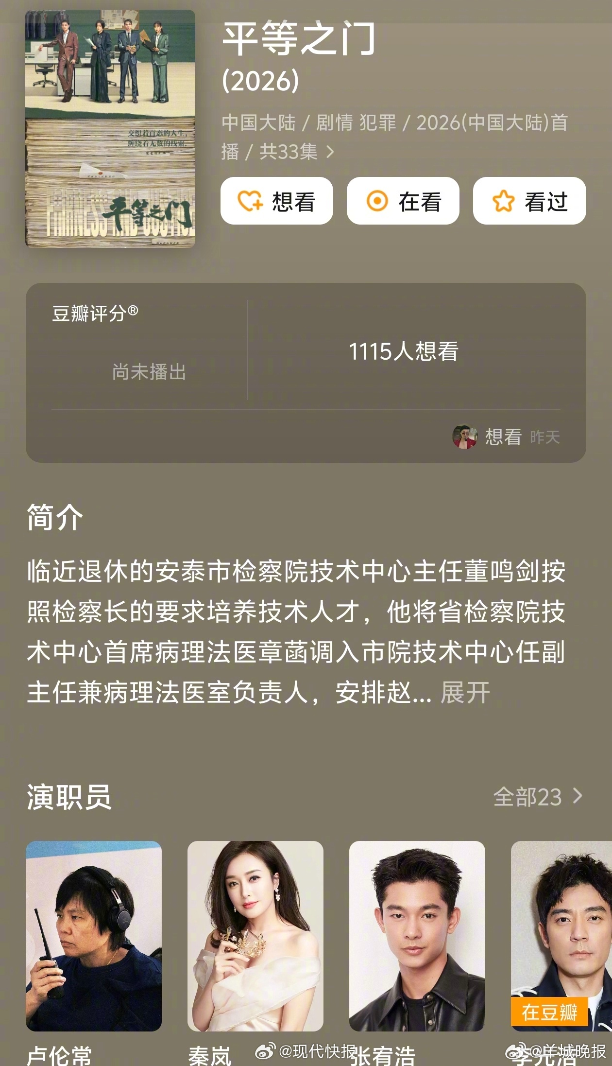 电视剧《平等之门》,与秦岚、张宥浩、李光洁、黄尧等演员合作出演。(现代快报)更多消息:#宋宁峰回应婚内出轨##李荣浩否认抄袭##李荣浩 哪个250会抄得一模一样##站姐团建##汪东城愚人节退圈##宋宁峰无限期暂停演艺工作#(编辑:惠天骄;审签:周乐瑞)