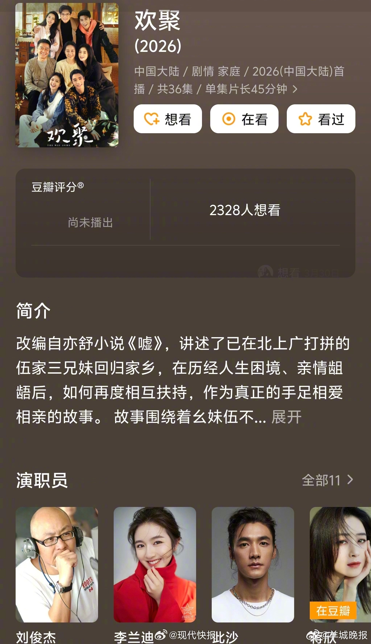 电视剧《欢聚》,搭档李兰迪、此沙、蒋欣、邬君梅、许亚军等演员;