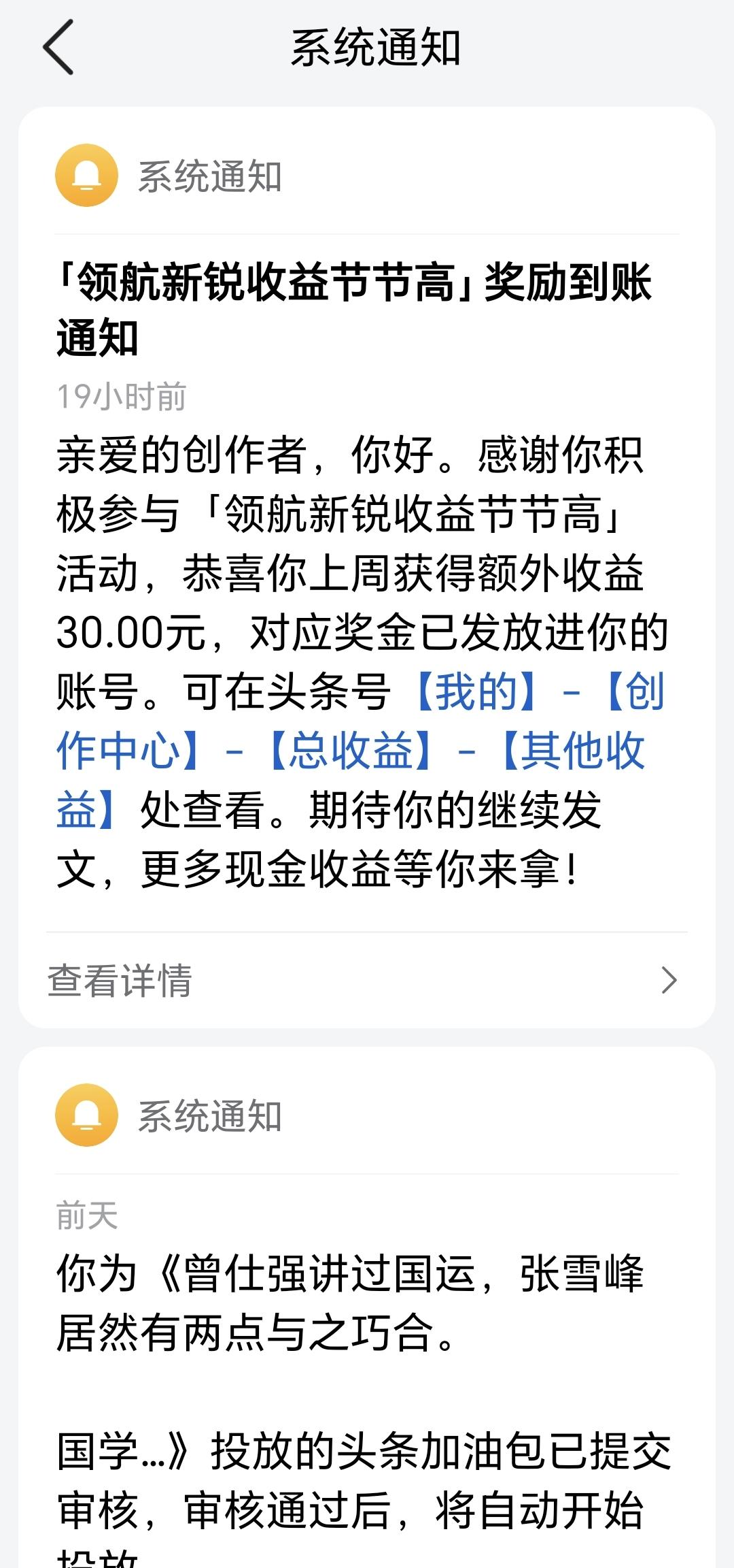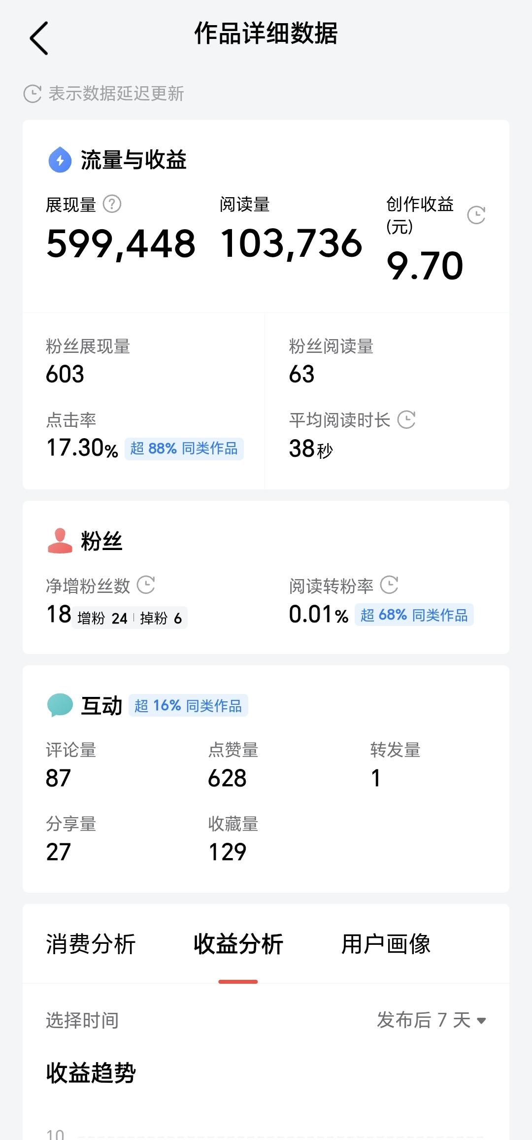 终于出了一篇阅读量10万的爆文,看看我一共收入了多少钱? 这篇微头条共321个字, 展现量59.95万,阅读量10.37万,点赞628,评论87,创作收益9.7元。 虽然收入不高,但因为这篇文章满足了“领I航新锐收益节节高”的条件,头条额外奖励了30元钱,这也是我第壹次拿到这项奖励,所以感觉还不错。