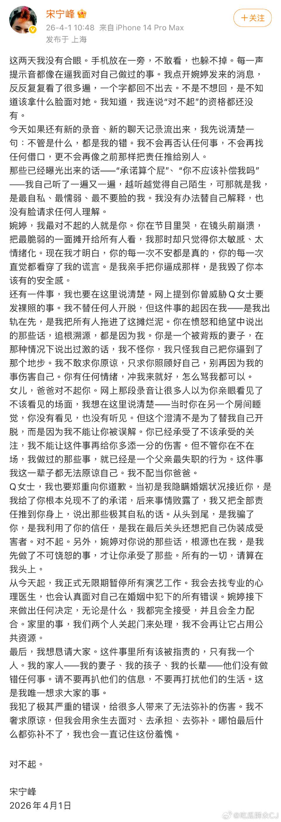 宋宁峰承认出轨!张婉婷置顶恩爱照看懵全网 4月1日上午,宋宁峰出轨风波闹得沸沸扬扬,他本人终于发长文回应。可谁也没想到,张婉婷非但没撕破脸,反倒把俩人的亲密照直接置顶,疑似选择原谅,这到底是怎么回事呢? 原来,宋宁峰在长文里彻底认了错,直言最对不起妻子张婉婷,反复强调所有错误都在自己,不找任何借口。同时他也向出轨对象Q女士致歉,连张婉婷威胁要发对方私密照的事,也主动把责任全揽了下来。 针对网传“带女儿出轨”的爆料,他澄清当时孩子在另一个房间睡觉,完全不知情。长文最后,他也宣布会无限期暂停演艺工作,寻求心理医生帮助,好好反思自己的错误。 可让人意外的是,张婉婷非但没苛责他,反倒在事发后晒出秀恩爱动态,大秀钻戒、晒俩人亲密合影,配文“爱情”“我不许有人带走我的天真”,还直接把这条动态置顶了,明摆着宣告自己才是这段婚姻里的赢家。 说起来,俩人一起上过的《再见爱人》里,同季苏诗丁&卢歌节目后彻底分开,陈美玲&艾威复合后一直安稳相守,从没出过原则性问题;其他季嘉宾就算没离婚,也都是生活习惯、沟通上的小矛盾,从来没出过出轨这种突破底线的丑闻。 网友们也吵翻了,有人觉得她是为了孩子才忍下这口气,也有人说当初看节目就知道,她爱宋宁峰远比对方爱她多。 如今夫妻俩大概率是要“一致对外”了,可宋宁峰被钉上“出轨男”的标签,演艺之路基本也走到头了。 你觉得张婉婷不离婚,到底是因为爱,还是为了孩子?