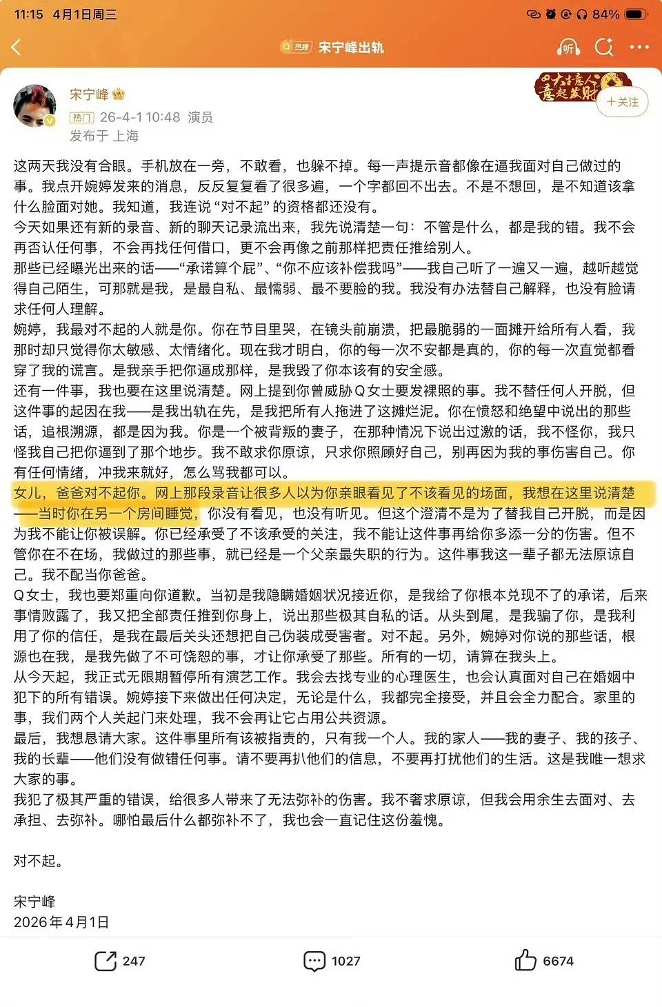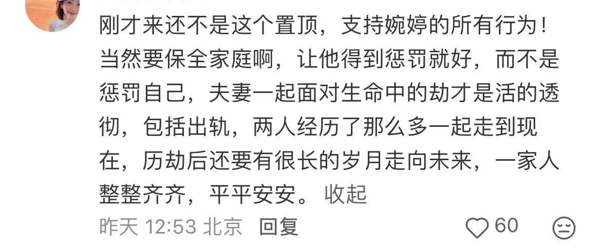 这个张婉婷真的是很有意思,老公带着孩子出轨闹得天下皆知,她反倒是大方秀恩爱。 好像在告诉所有人:“我老公什么样,我都爱,我们家的事,用不着你们操心。” 知道老公宋宁峰出轨后,张婉婷就更新过一条秀恩爱动态,晒钻戒晒合影。 宋宁峰现在发长文道歉,她又把这条动态置顶了。 我是真的看不懂了。