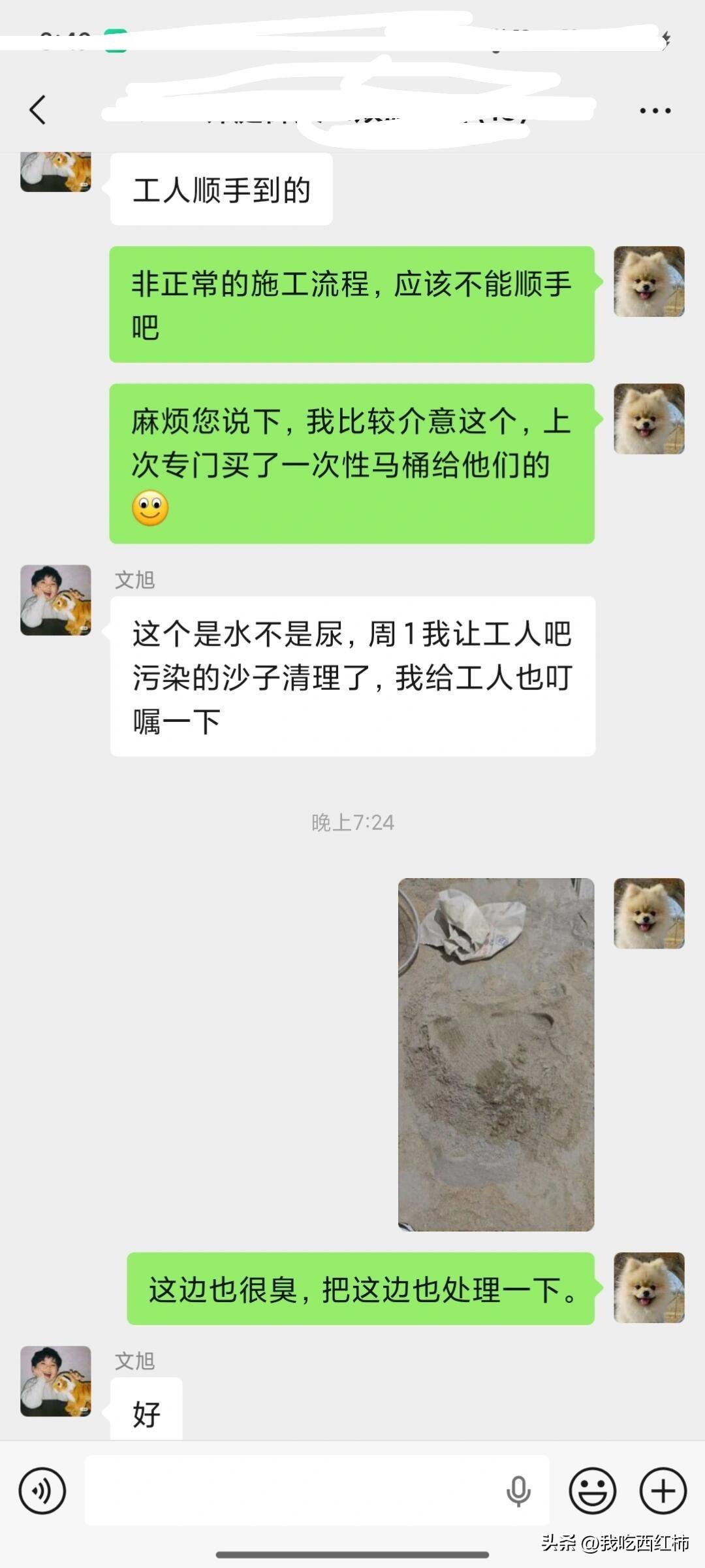 发现瓦工在沙子里尿尿 贴瓷砖前,专门买了一次性马桶,(装修公司其实有一次性马桶,但第一次发现沙子上有不明液体,当时怀疑是尿,没有味道就打消了念头,因为这件事情专门买了一个一次性马桶交给师傅的),这次来,又发现沙堆上有不明液体,闻了一下差点🤮了,一股刺鼻臭味,工长还不承认怎么办