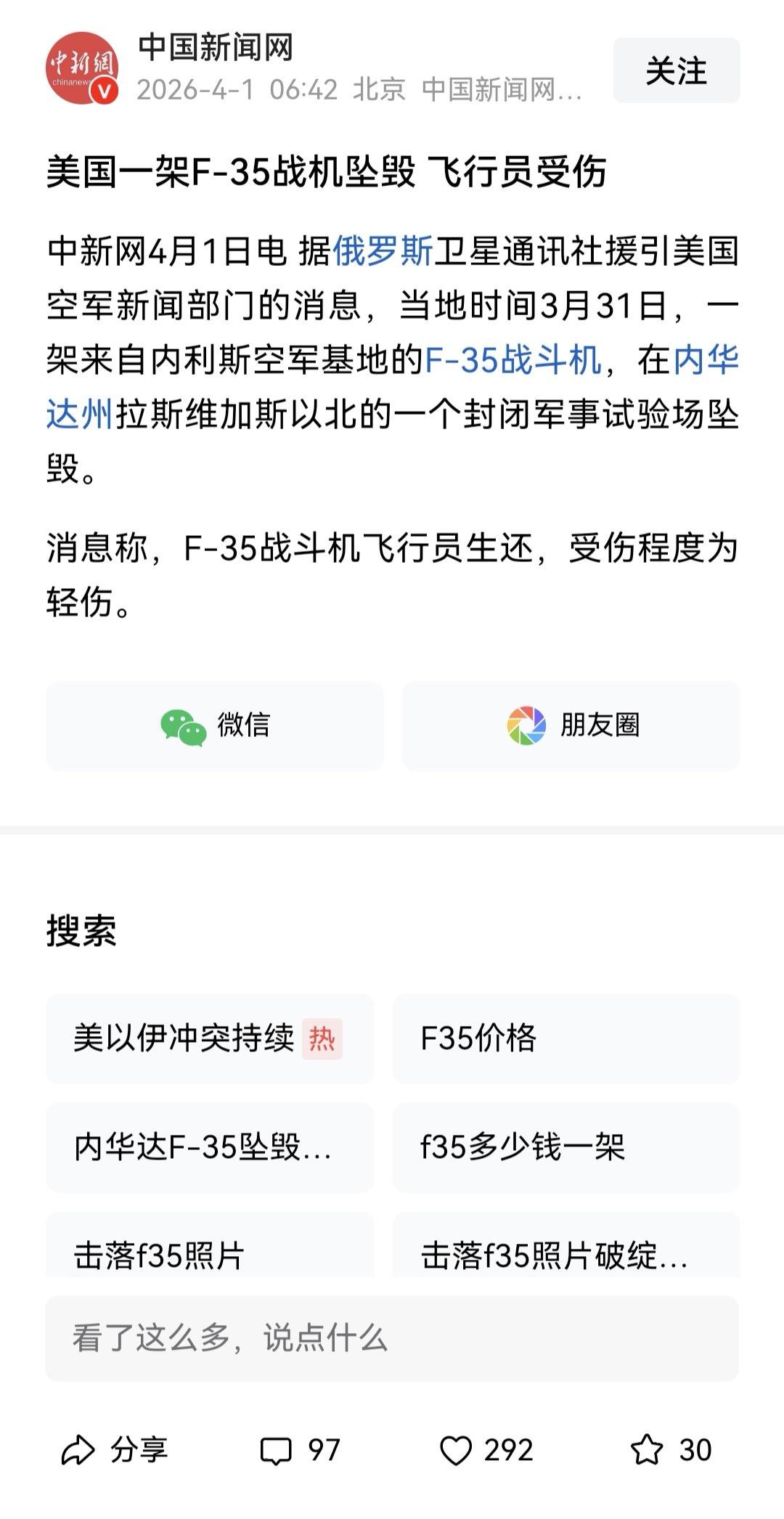 81192,25年前的今天,英雄王伟说“81192收到,我已无法返航,请继续前进”。 每次听到这个声音,总是激动不已。他牺牲了性命,托起了一个国家的尊严,所以他永远值得被铭记。 25年后的今天,一架美国F35战斗力坠毁,或许这个微小的符号是国家力量强弱、攻守之势的转换标志。 如果他的英雄灵魂能够听到,只想告诉他这盛世如你所愿。