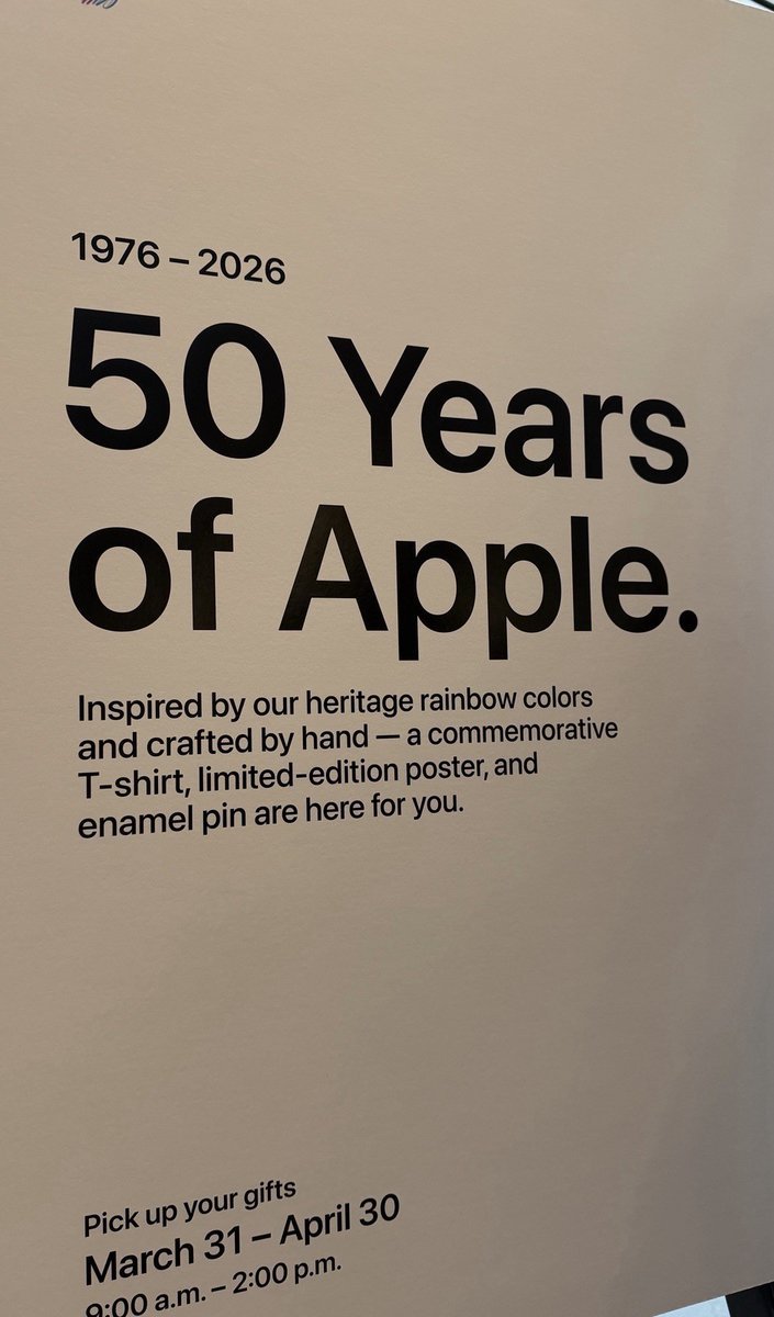 Apple 于 3 月开启了 50 周年系列庆祝活动,并在全球多地举办了音乐会和“Today at Apple”系列活动。其中包括在纽约举办的 Alicia Keys 演唱会、在成都举办的李宇春演出、在伦敦举办的 Mumford & Sons 乐队演唱会、在温哥华与职业花样滑冰运动员 Elladj Baldé 的见面会、在悉尼举办的由 Bailey Pickles 用 Logic Pro 创作乐曲的灯光秀等等。