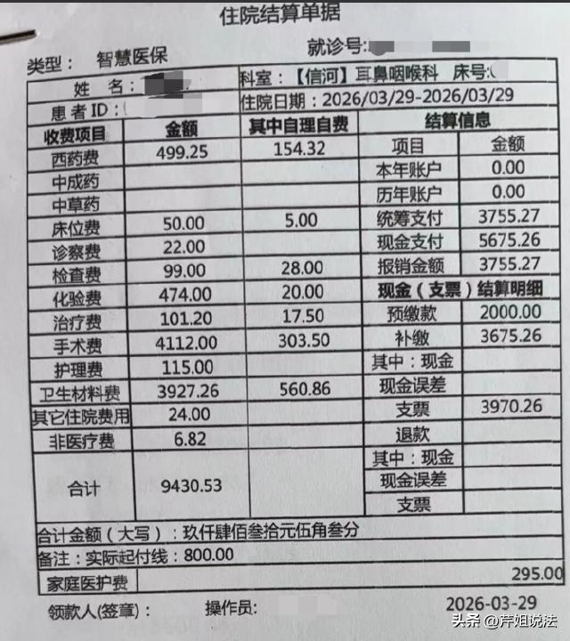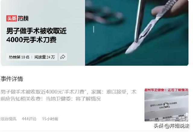 浙江温州,尹女士带儿子去医院解决鼻子问题,医生建议手术。手术顺利完成后,结账时尹女士却傻眼了!总费用9430.53元里,材料费竟高达3927.26元。一问才知,这钱全花在一把“一次性手术刀”上了!尹女士当场就火了,术前怎么没人告知要收这笔钱?也没说刀这么贵!医院不提供手术刀难道让家属自己带?这“先斩后奏”的做法太不地道。这刀到底凭什么这么贵呢? 这事,还得从尹女士的儿子鼻子堵了半年多说起。 那段时间,孩子晚上睡觉打呼,还老容易窒息,尹女士天天盼着能早点解决。 3月下旬,她终于逮着机会,带儿子去做了个检查,检查后,说必须手术,尹女士也没多想,为了孩子,手术就手术呗。 29号那天,手术挺顺利,尹女士悬着的心也落了地。 可结账时,她一看账单,整个人都懵了,9430.53元里,材料费就近4000元,还是一把一次性手术刀的费用。 尹女士认为:术前没人提这刀要单独收费,还这么贵?这不是坑人吗? 她觉得医院没尊重家属知情权,要是提前说有进口和普通刀可选,或者告知是自费,家属也能有个准备。 现在刀用了,钱交了,感觉被狠狠宰了一刀,这谁能受得了? 不光是在意刀值不值4000,更在意医疗收费透明度,毕竟谁也不想去医院被当冤大头。 相关部门也介入调查了,希望能给尹女士一个合理说法,这医疗收费,确实得好好整整了。 大家也都好奇,这医院到底有没有责任呢?术前不告知收费项目,到底合不合法? 根据消费者权益保护法,消费者享有知悉其购买、使用的商品或者接受的服务的真实情况的权利。 这手术刀收费,显然属于服务费用的一部分,医院在术前,是不是得告知尹女士呢? 要是没告知,那可就侵犯了尹女士的知情权了。 去医院看病,和医院之间,其实形成了一种服务合同关系。 医院提供医疗服务,咱们支付费用,这合同里,是不是得明确服务内容和费用呢? 要是医院没提前告知,术后才说要收这笔钱,那可就违反了合同法的诚实信用原则了。 尹女士作为消费者,有权要求医院提供详细的服务内容和费用清单,医院也有义务在术前告知,这手术刀的费用,到底收不收,收多少。 医院收费,是不是得明码标价,让患者和家属一目了然呢? 要是医院利用信息不对称,故意隐瞒或者模糊收费项目,那可就涉嫌欺诈了。 医院术前没告知手术刀收费,术后才说要收钱,这明显是不合理的。 尹女士有权要求医院退还这笔费用,或者通过法律途径维护自己的权益。 毕竟,消费者的权益,可不是能随便被侵犯的。 医院本是救死扶伤的地方,却因为一些不透明的收费,让患者和家属寒了心。 对此,您怎么看呢,欢迎在评论区一起来留言讨论吧! 信息来源:法治视讯、