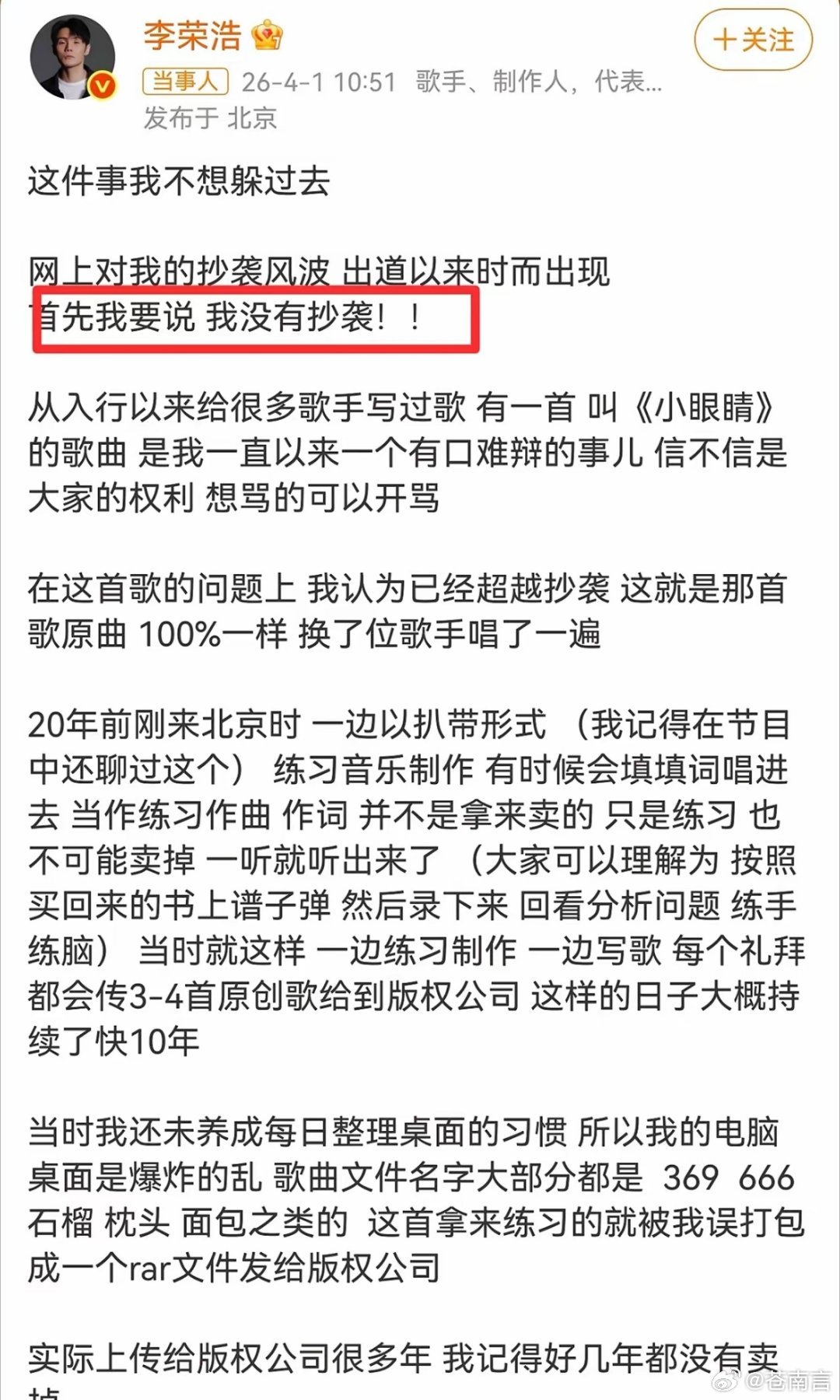 李荣浩否认抄袭说实话,看完这篇长文,真的挺感慨的。这要是换作别的艺人,可能就含糊其辞混过去了,李荣浩倒好,连自己当年电脑乱、刚出道有外貌包袱这种小事都讲了,一点不装,就是实打实把来龙去脉说清楚。其实李荣浩一直都是这样,说话直来直去,不搞艺人那套虚头巴脑的。他早就说过自己不适合娱乐圈,比起上综艺、赶晚会,他更爱闷头写歌编曲。这次把压了十几年的心事说开,也算是给自己一个交代了。抄袭这种事,从来都是艺人的雷区。李荣浩这次直接把所有细节摆到台面上,不躲不藏,不管大家信不信,至少这份坦荡,还是挺难得的。