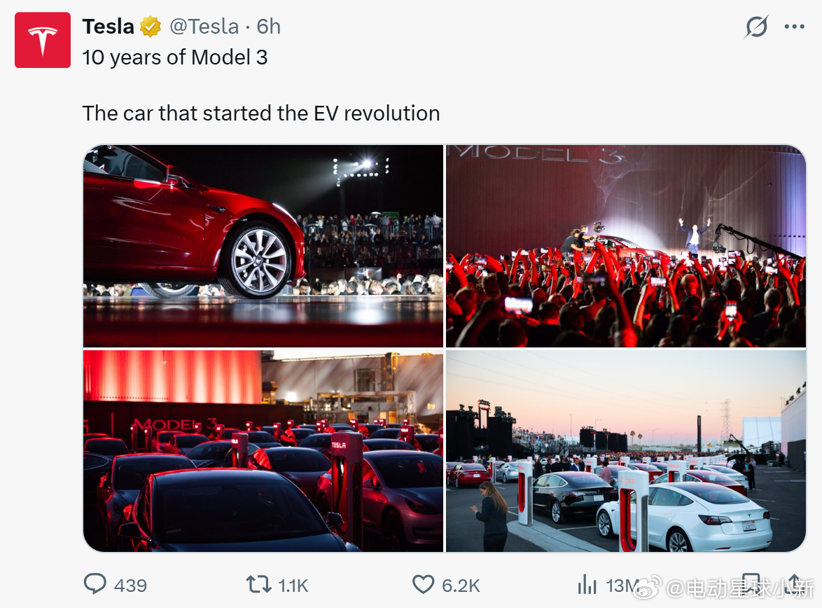 特斯拉 Model 3 迎来发布十周年,全球累计销量已突破 300 万辆。