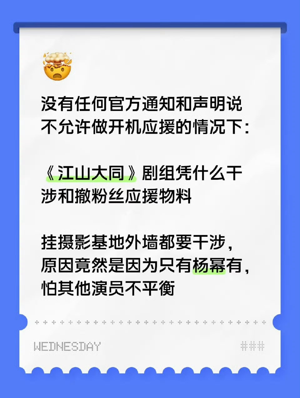 我去,没有任何江山大同官方出来说过不能搞开机应援,就因为其他演员家没有杨幂家应援准备充分,就直接把粉丝线下应援撤了?哪有这么欺负人的,给粉丝退💰好吗,给你脸了?从官宣到现在就一直在挑衅,一直不愿意参与这些事是害怕被打成带节奏的,可是这真的太过分了吧!!!