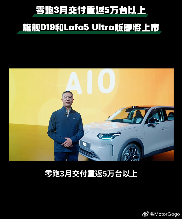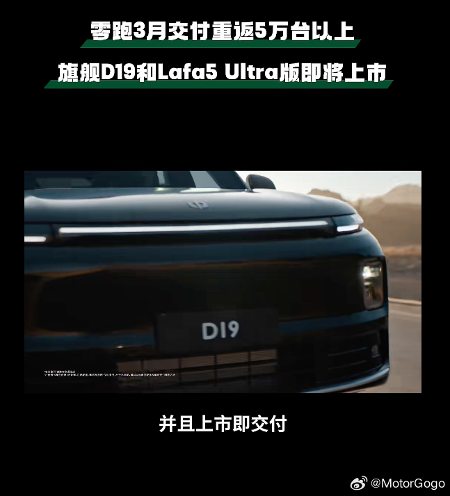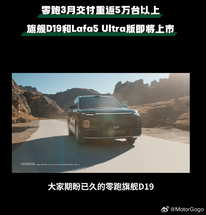 零跑 3 月份重返 5 万台的销量成绩,朱江明特意拍了一个视频公布 3 月份交付成绩,同时还预告了接下来 4 月份上市的两款新车:Lafa5 Ultra 以及全新的 D19,两台车都是「上市即交付」!