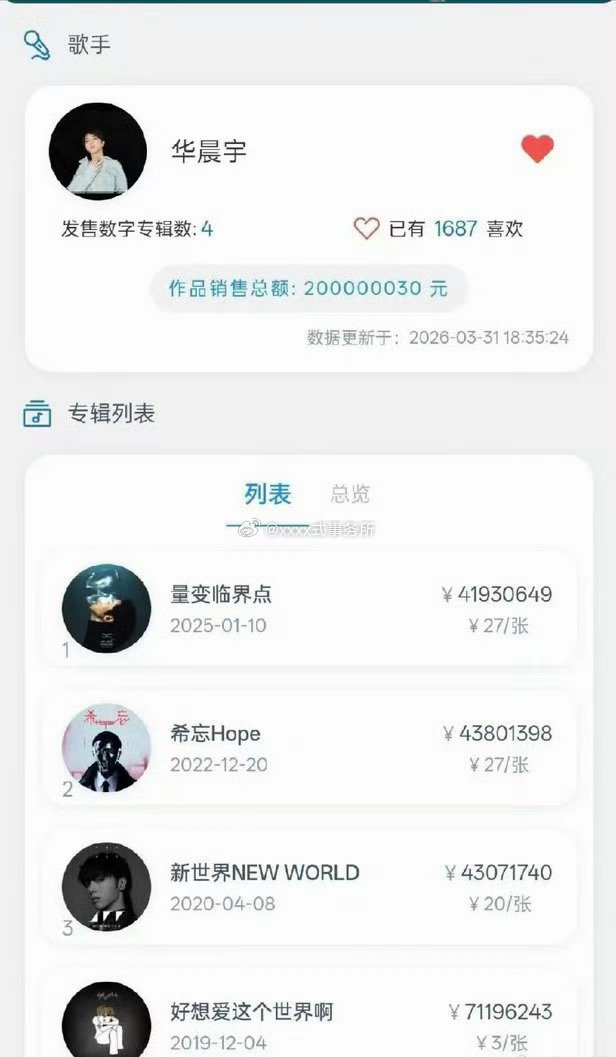 华晨宇数字专辑总销售额突破2亿🎉🎉而且这仅仅是数字专辑,还没有算上实体专辑?