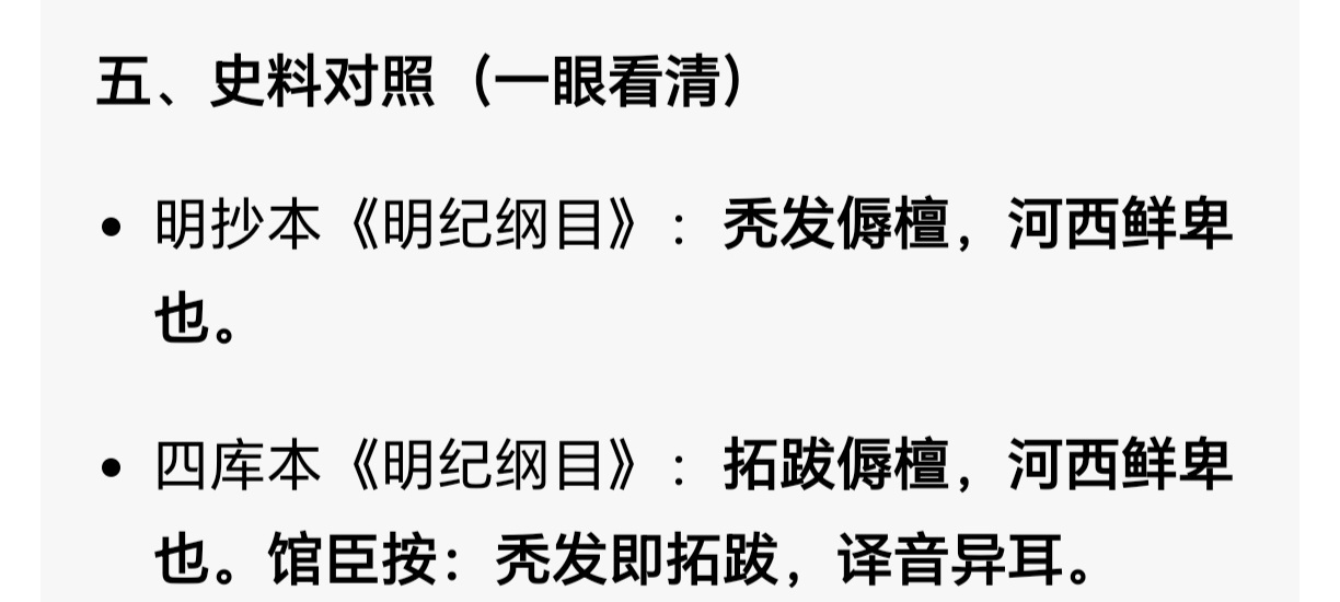 明朝记载河西鲜卑:秃发氏,明《资治通鉴》(明万历本): 秃髮 即 拓跋 之轉。鮮卑謂被為「秃髮」,猶言「毯」也。音與「拓跋」近,故譯者或異,华夏大量记载秃发鲜卑的称呼,后来都被乾隆改了,还是明朝称呼比较准确,让人一目了然,发型和今天犹太人差不多。