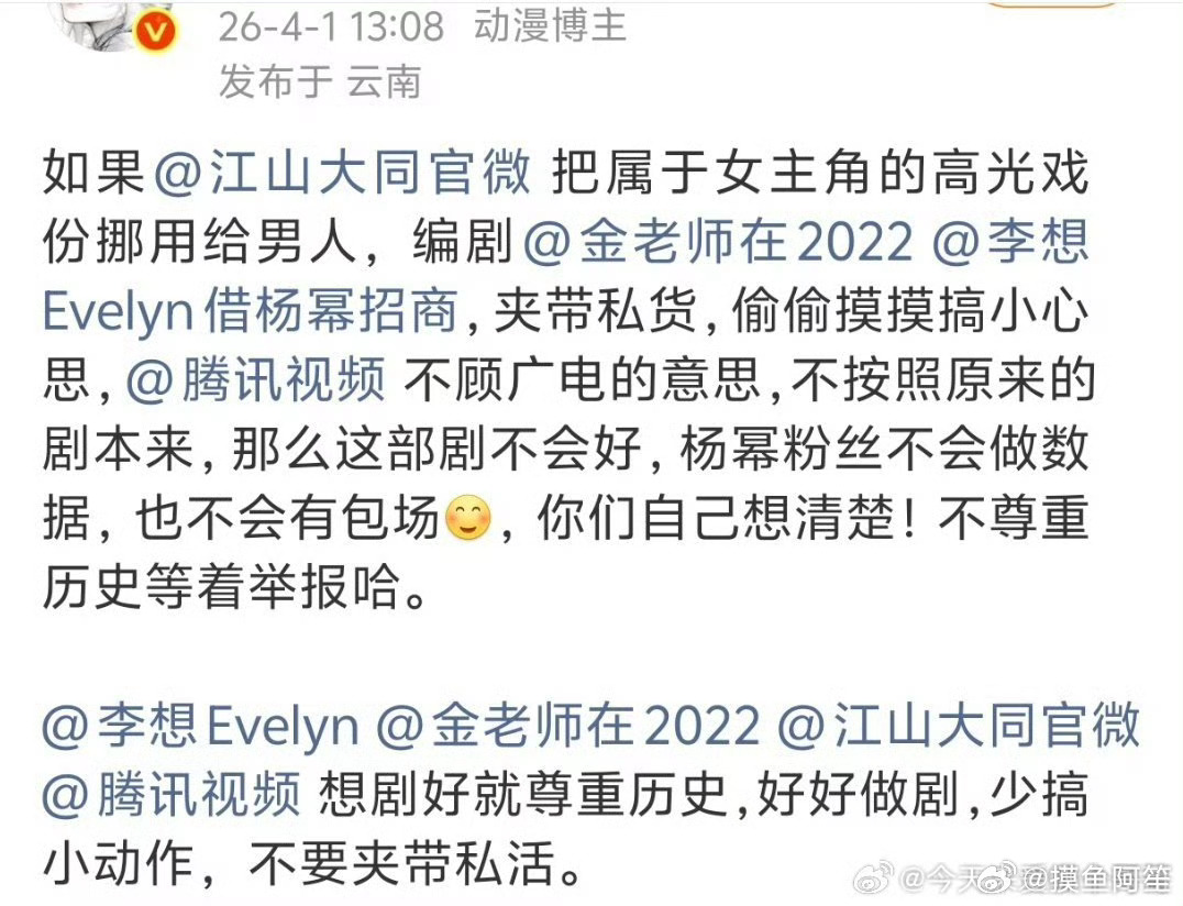 杨幂粉丝向江山大同剧组和维权,据说是看通告单觉得杨幂戏份很少