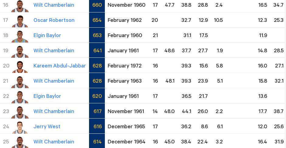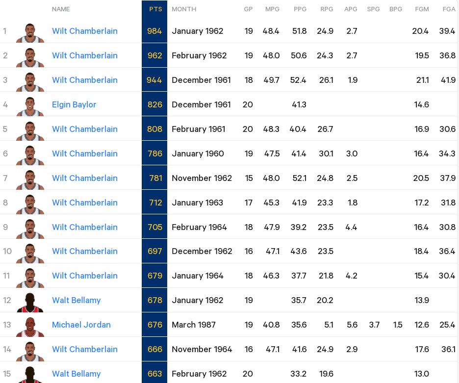 平平无奇?东契奇单月轰下600分,现役第2人,但在NBA历史竟然进不了前25! NBA历史单月总得分前25分别是: 25.张伯伦 614分 1964年12月 24.韦斯特 615分 1965年12月 23.张伯伦 617分 1961年11月 22.贝勒 620分 1961年1月 21.张伯伦 628分 1963年2月 20.贾巴尔 628分 1972年2月 19.张伯伦 641分 1961年1月 18.贝勒 653分 1960年2月 17.大O 654分 1962年2月 16.张伯伦 660分 1960年11月 15.贝拉米 663分 1962年2月 14.张伯伦 666分 1964年11月 13.乔丹 676分 1987年3月 12.贝拉米 678分 1962年1月 11.张伯伦 679分 1964年1月 10.张伯伦 697分 1962年12月 9.张伯伦 705分 1964年2月 8.张伯伦 712分 1963年1月 7.张伯伦 781分 1962年11月 6.张伯伦 786分 1960年1月 5.张伯伦 808分 1961年2月 4.贝勒 826分 1961年12月 3.张伯伦 944分 1961年12月 2.张伯伦 962分 1962年2月 1.张伯伦 984分 1962年1月 此外,现役球员中,哈登曾经在2019年1月有过单月610分的表现。 回看单月总得分榜单的前25位,除了乔丹和贾巴尔外,其他的都是在上古时代的,而且集中在1961年到1965年之间。 当然了,更夸张的是什么呢,就是前10中有9个都是张伯伦的,前25中有16个是张大帅的。这也再次得出一个结论,就是在讨论高分的时候,张伯伦永远是那道别人很难跨过去的坎:在张伯伦面前,所有人包括乔丹都是弟弟,甚至是弟中弟。