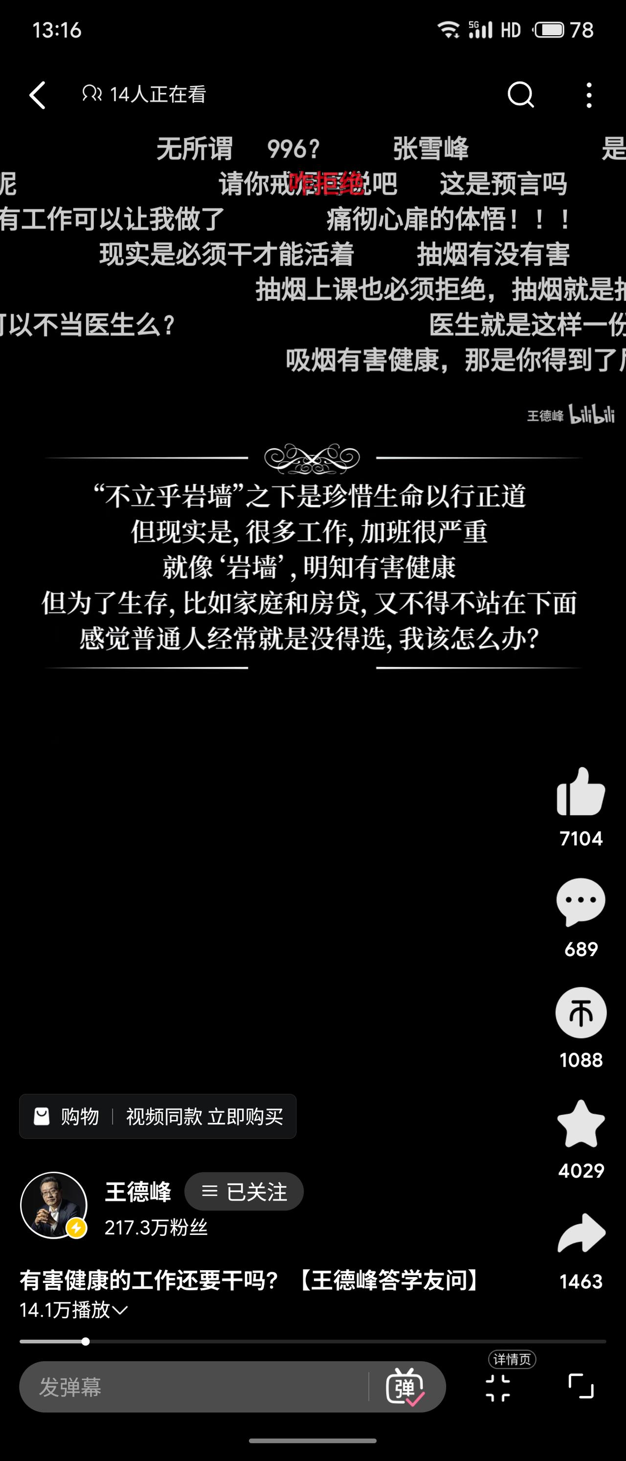 王德峰先生借“不立乎岩墙之下”点明了困境:道理上,人该远离危墙,珍惜生命;现实中,却有人为了房贷、生计,不得不站在加班、有害健康的工作这堵“岩墙”下。弹幕里“没钱”“现实是必须干”正是这种无力感的写照。 但王老师强调的“自由”,或许不在于能否立刻转身离开,而在于内心始终保有一份觉察——清醒地知道自己在承受不该承受的东西,不把被动当作理所当然。这份清醒本身就是一种拒绝的姿态:身或许暂时无法抽离,心却不与之完全认同。真正的自由,始于在不得不低头时,依然保持精神上的不屈服。