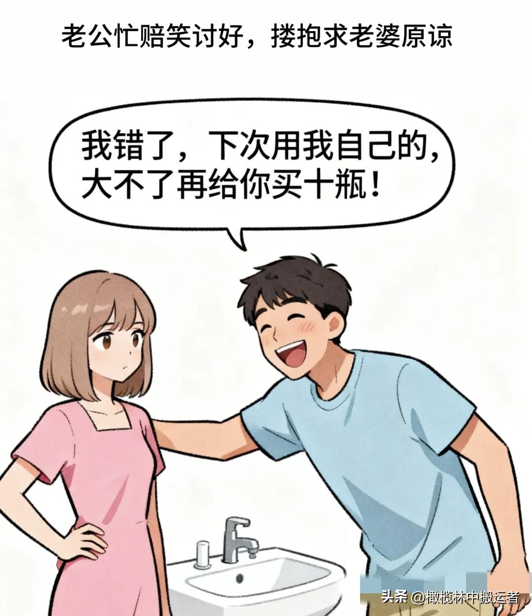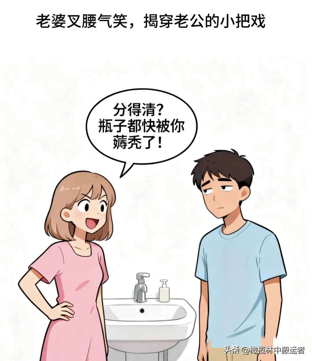 趣味漫画:老婆斜瞟老公:你是不是又把我洗面奶当洗手液用了?老公挠头装傻:哪能啊,