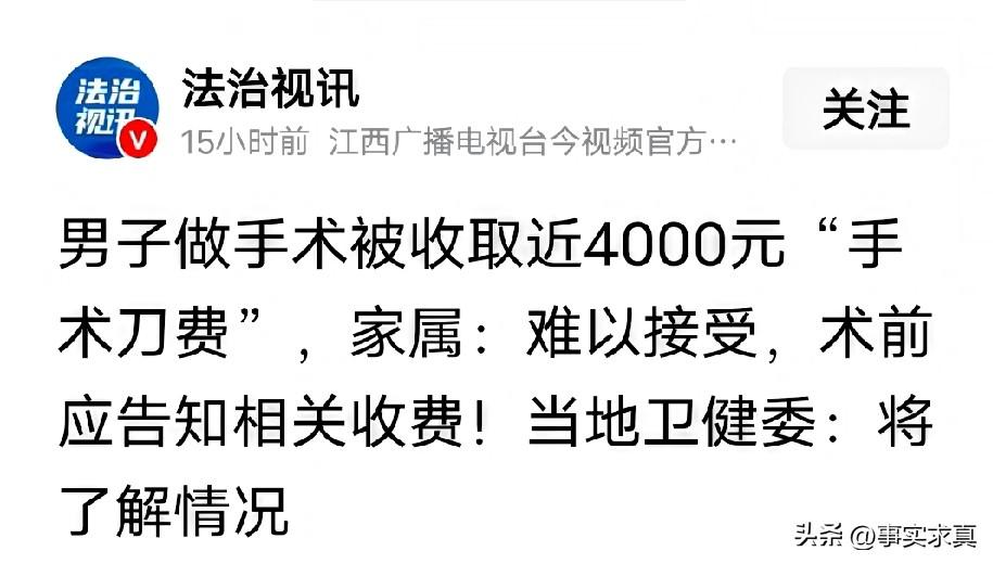 温州医院天价手术刀,当地卫健委介入调查核实 近日,温州尹女士发了一段儿子手术的视频,据尹女士讲,儿子在温州人民医院做了一个鼻炎手术,术前医生让签字时医疗材料费3900多元,手术成功后的账单上多出4000多费用,尹女士找到医生询问4000多是什么钱,医生告诉她这多出来的是手术刀费用,尹女士有点想不明白,先前让自己签字的医疗材料费里不包括手术刀费用吗?此事被曝光后当地卫健委已经介入调查核实,尹女士表示医疗材料费用多少可以接受,但是你不能术前不知道术后你说这是单算的吧,作为患者有权知道的