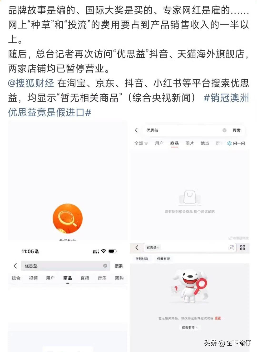 央视曝光“优思益”:一场精心包装的“进口”骗局 4月1日,央视曝光了知名保健品品牌“优思益”的造假套路。表面上标榜澳洲进口,背后却是一整套从产地到专家的全链条伪造。 所谓“澳洲原产”,实为汽车修理厂 品牌标注的澳大利亚生产地址,实际竟是一家汽车维修厂。产地造假,是这场骗局的第一步。 没有故事就编,专家背书全靠买,负责推广的杭州所向营销公司直言:“没有品牌故事就编造。”不仅如此,连澳洲大学教授、医学博士等专业背书,也都是花钱买来的。 成本20元,售价超400元。一瓶产品成本仅20元左右,贴上“进口”标签后,售价高达293至434元,溢价超过10倍。 销量惊人,多个平台品类第一,该品牌年销量超过260万瓶,天猫、抖音等平台的保健品品类中均位列第一。不少消费者正是冲着明星推荐和平台榜单下单。 目前多平台下架,用户维权进行中。央视曝光后,抖音、天猫等平台已紧急关停其店铺。大量消费者要求退款赔偿。据不完全统计,该品牌累计销售超过400万瓶。 这不是第一个,也不会是最后一个 “优思益”只是进口保健品市场乱象的一个缩影。 ✅ 购买保健品务必认准“蓝帽子”标志(国家保健食品认证) ✅ 不要轻信明星推荐或平台榜单 ✅ 高溢价≠高品质,警惕“进口”光环下的陷阱