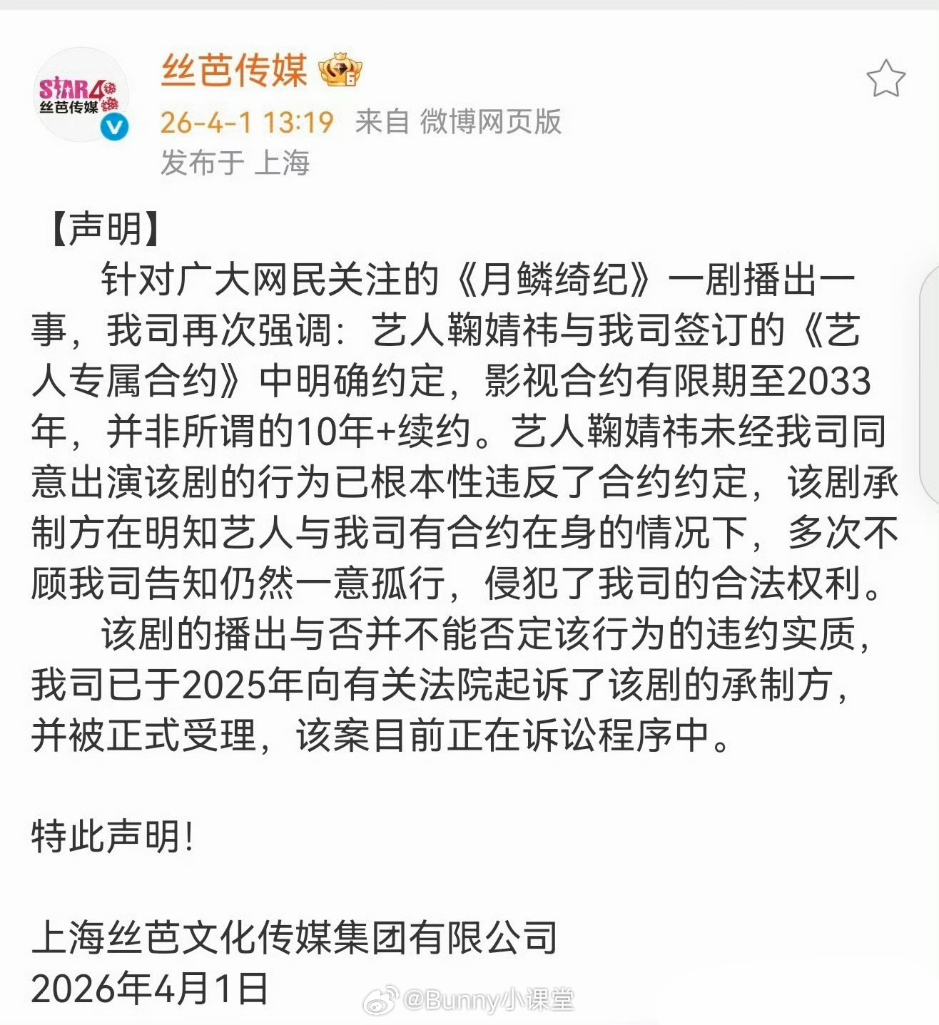 丝芭传媒发声明称已起诉月鳞绮纪剧方,并强调鞠婧祎与丝芭影视合约有限期至2033年,鞠婧祎未经公司同意出演该剧已违反约定。该剧承制方明知艺人有约的情况不听劝阻一意孤行,侵犯公司合法权益。现在这条声明又被秒删了…… 丝芭 月鳞绮纪