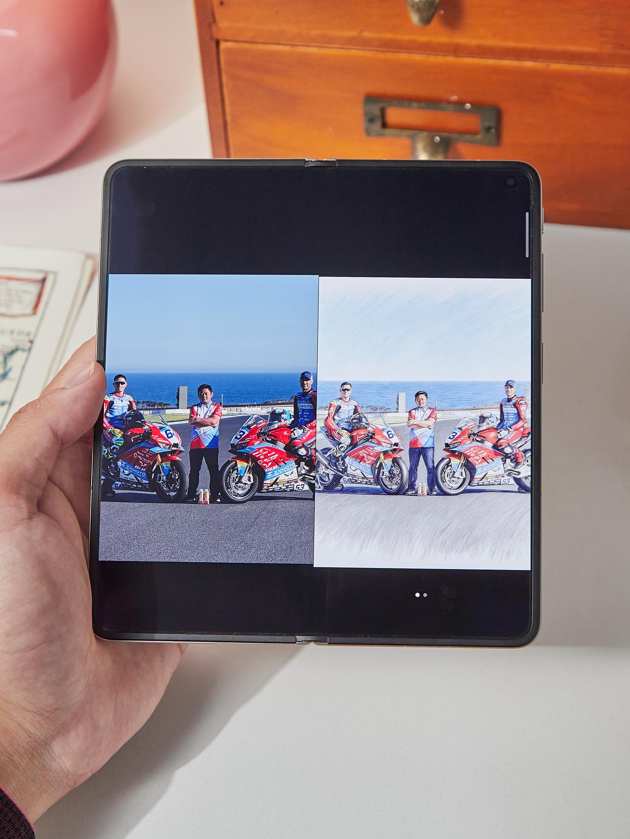看完张雪夺冠后,我这一个操作艺术已成... 翻到张雪夺冠的视频时,左边是二十年前他骑着改装车在泥地里飞的画面,大声喊出“有梦想就去追”;右边是这次央视专访里的他,看完真的有点顶不住。 2006年还在泥地里跑改装车,到2026年带着车队站上世界冠军领奖台,从车手到创始人,这条路他走了二十年。最燃的是两次“生吃”对手的镜头,从第三名一路杀到第一,看得人热血翻涌。 话说回来,用Find N6大屏分屏看这种对比确实很合适。左边是少年的意气,右边是如今的光环,两个时空叠在一起,有些东西不需要多说,看画面就够了。 随手用AI手写笔圈选,生成了一张车队夺冠的艺术画,左右分屏放一块对比更有感觉了。赛场的硝烟、冠军的瞬间,都还原得很真实。二十年磨一剑,这份热血确实值得被记住。你们也被张雪燃到了吗? 张雪机车张雪 张雪500rr 张雪820rr OPPOFindN6 OPPO